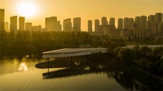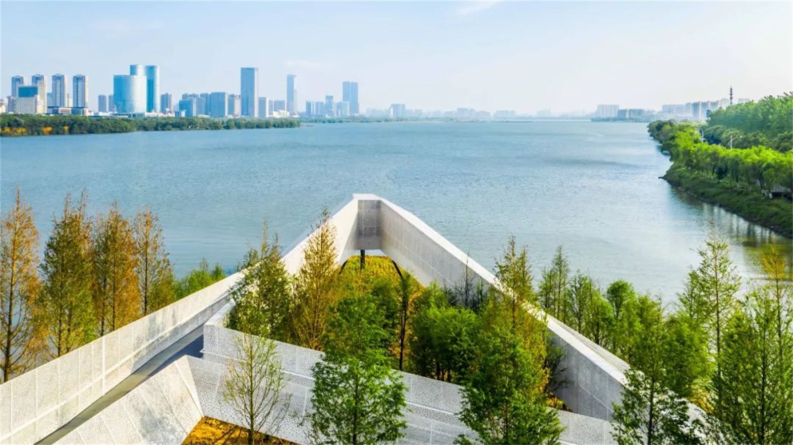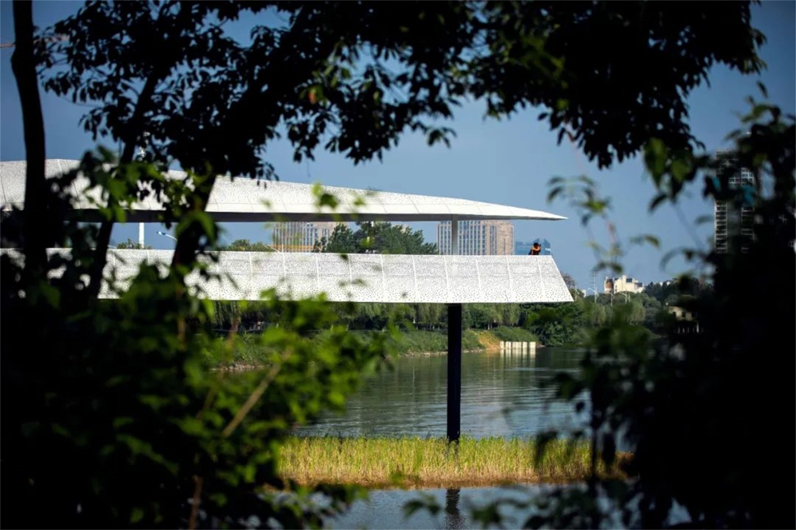 Bridges, platforms, pavilions and viewing towers are carefully placed to provide attractive focal points. Their contemporary design helps bring a modern taste and sense of progress to the ancient city, which dates back well over 2,000 years.. Perforated aluminum plate is the main material used for the installed structures, creating an arresting contrast with the natural setting. At the park’s main entrance, a cafeteria is integrated with an overpass across a six-lane road, connecting Fish Tail Park with the neighboring Aixi Lake Park.