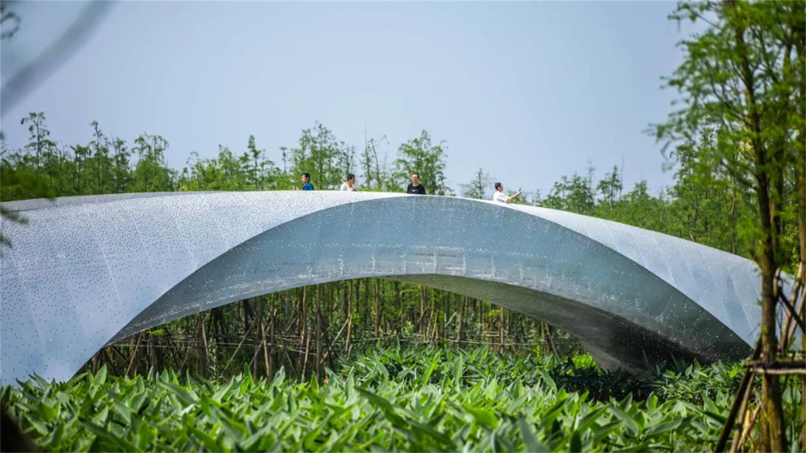 設(shè)計(jì)師通過精心布置的橋梁、平臺(tái)、亭臺(tái)樓閣和觀景塔,使場(chǎng)地上形成了獨(dú)具吸引力的人氣焦點(diǎn)。這里的現(xiàn)代設(shè)計(jì)語(yǔ)言,為這座2000多年的古城帶來(lái)了當(dāng)下的審美自信和進(jìn)步的氣息。設(shè)計(jì)中,穿孔鋁板是設(shè)施安裝的主要材料,它與自然環(huán)境形成強(qiáng)烈對(duì)比,形成人工與自然鮮明的反差之美。在公園的主入口,一家自助餐廳與橫跨六車道的步行橋融為一體,將魚尾洲公園與鄰近的艾溪湖公園緊密相連。