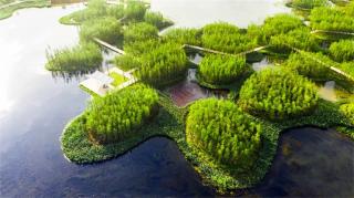 Inspired by the ancient concept of farming atop marshland, and by simple cut-and-fill techniques such as the Aztec Chinampas, or floating garden system, the coal ash dumped on site was recycled and mixed with dirt from the fish pond dykes to create numerous islets.