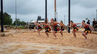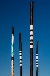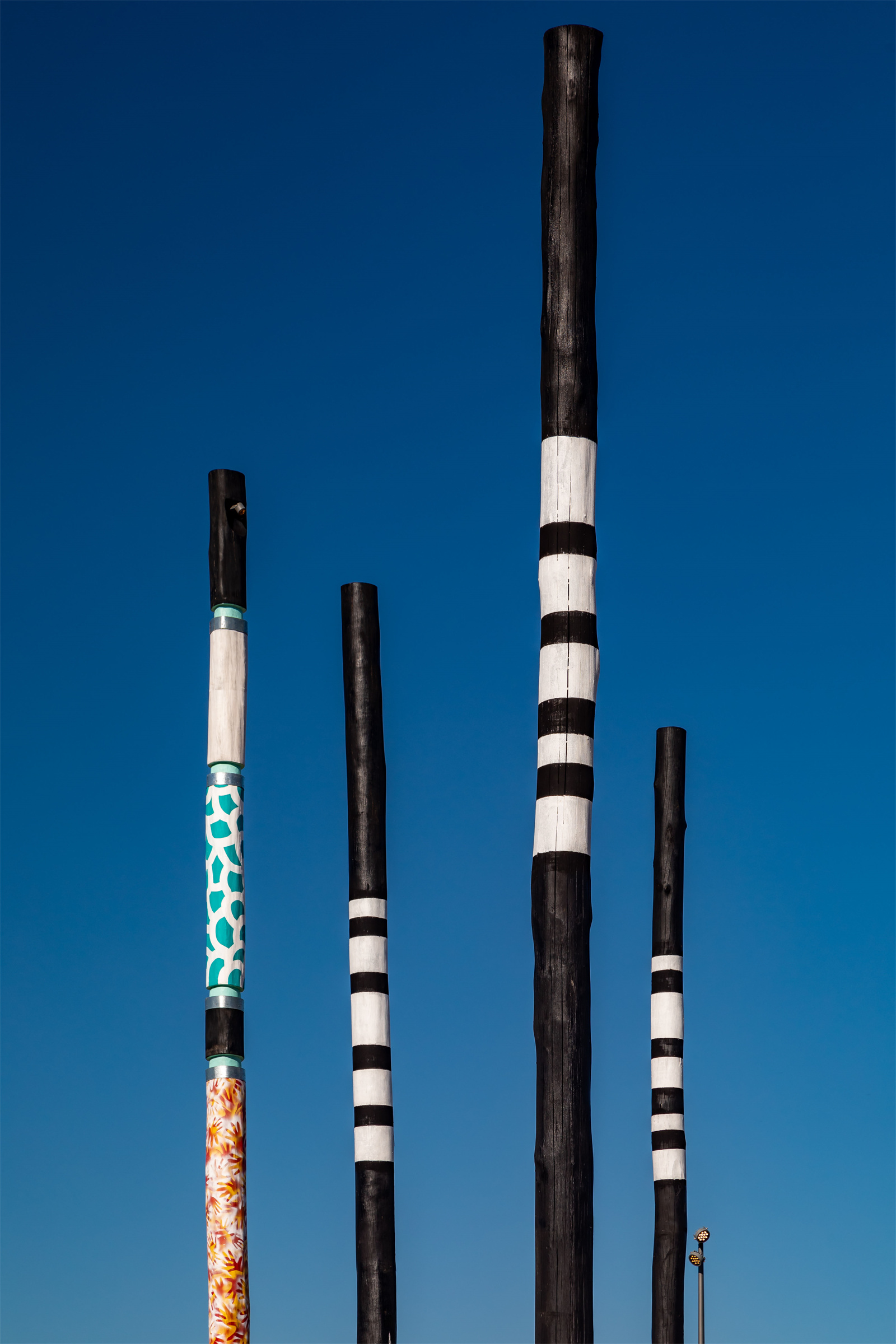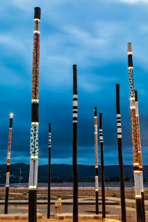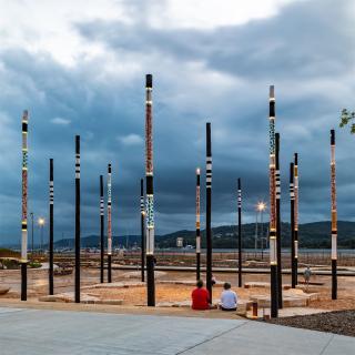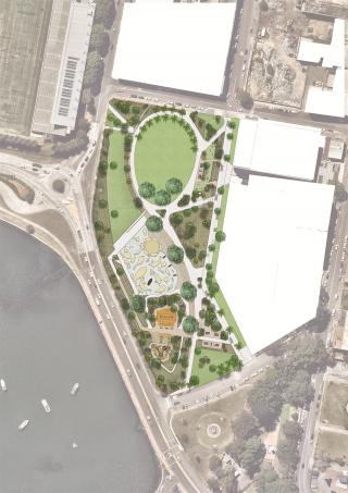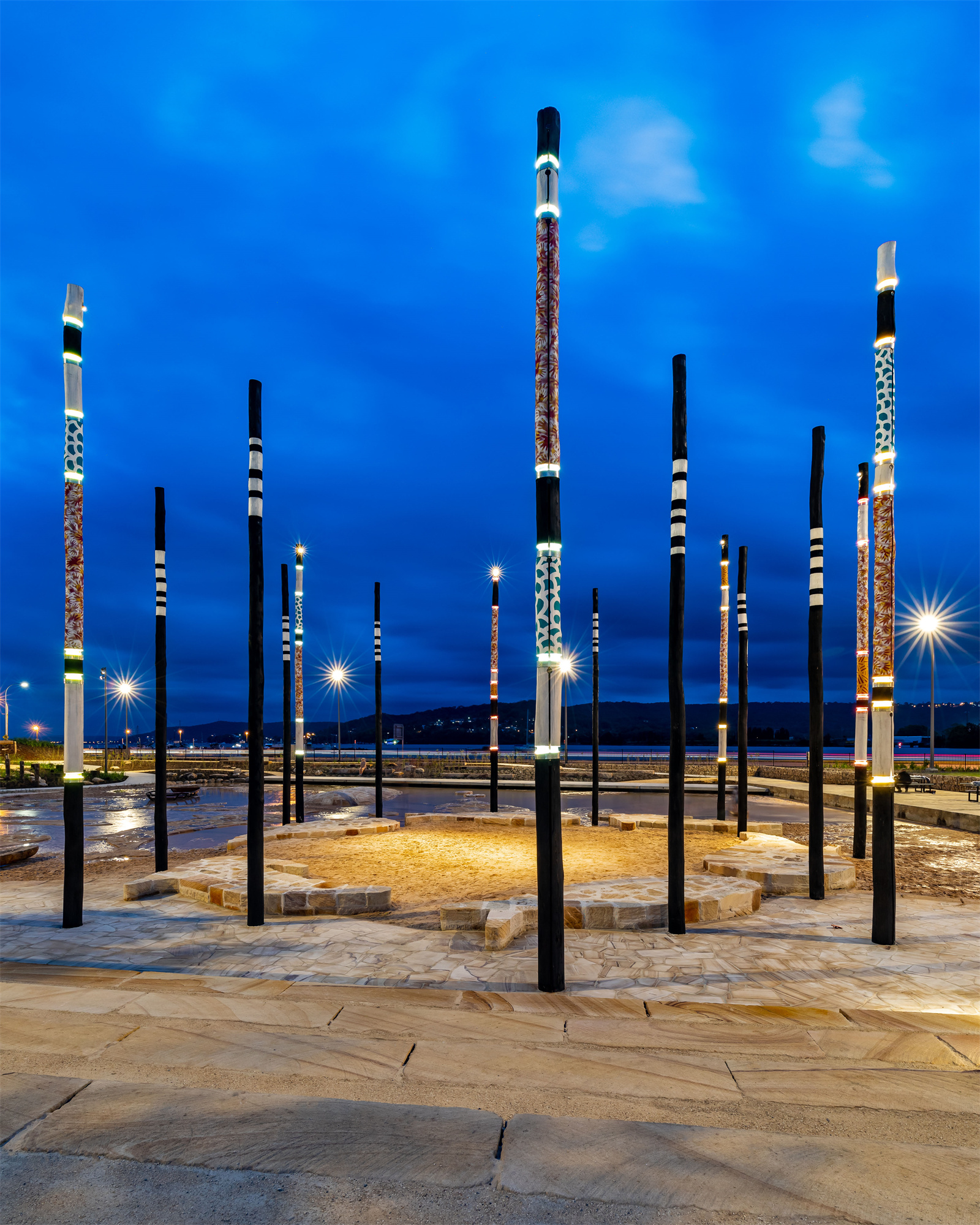 潮汐階地變成為所有人打造的新集會場所,它講述著與那些古老巖刻、營地,以及與其他文明相接觸時的歌謠與故事。公園中央地帶是一個社區(qū)中心節(jié)點(diǎn)Norimbah,一個由部落和村莊以原木圖騰框定的舞池。神話中的海洋生物以當(dāng)?shù)貛r刻手法做成石階,它們仿佛正在潮水中歡游,重新在復(fù)原的海岸線上棲息下來,又像是從海灣游來,環(huán)繞著Norimbah和菲利普斯號玩耍。神話與歷史這兩首歌謠便如此般地永遠(yuǎn)交響合奏著。