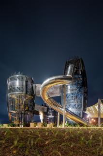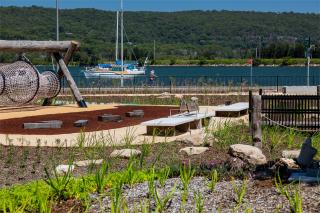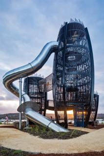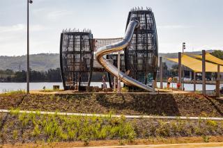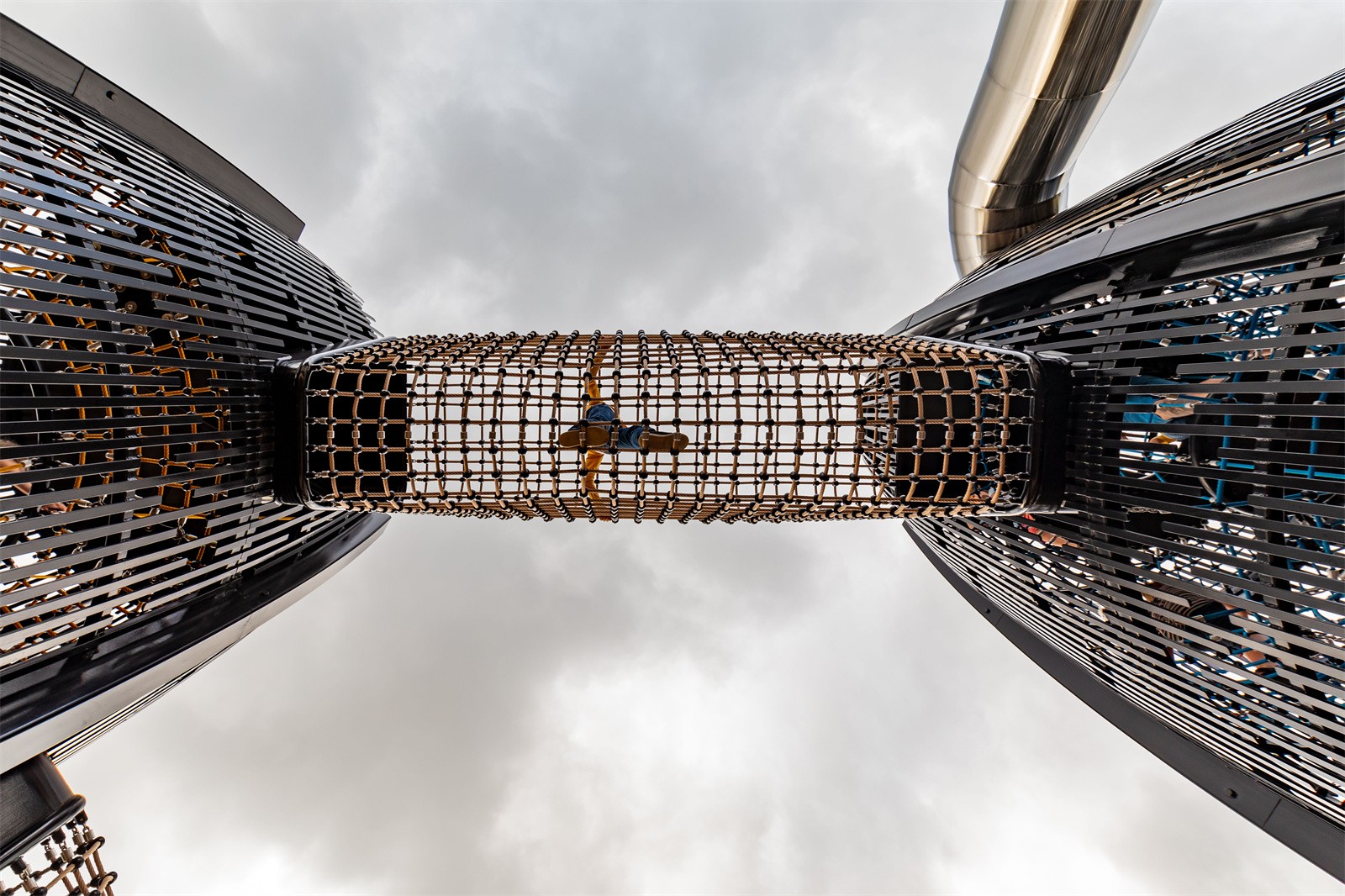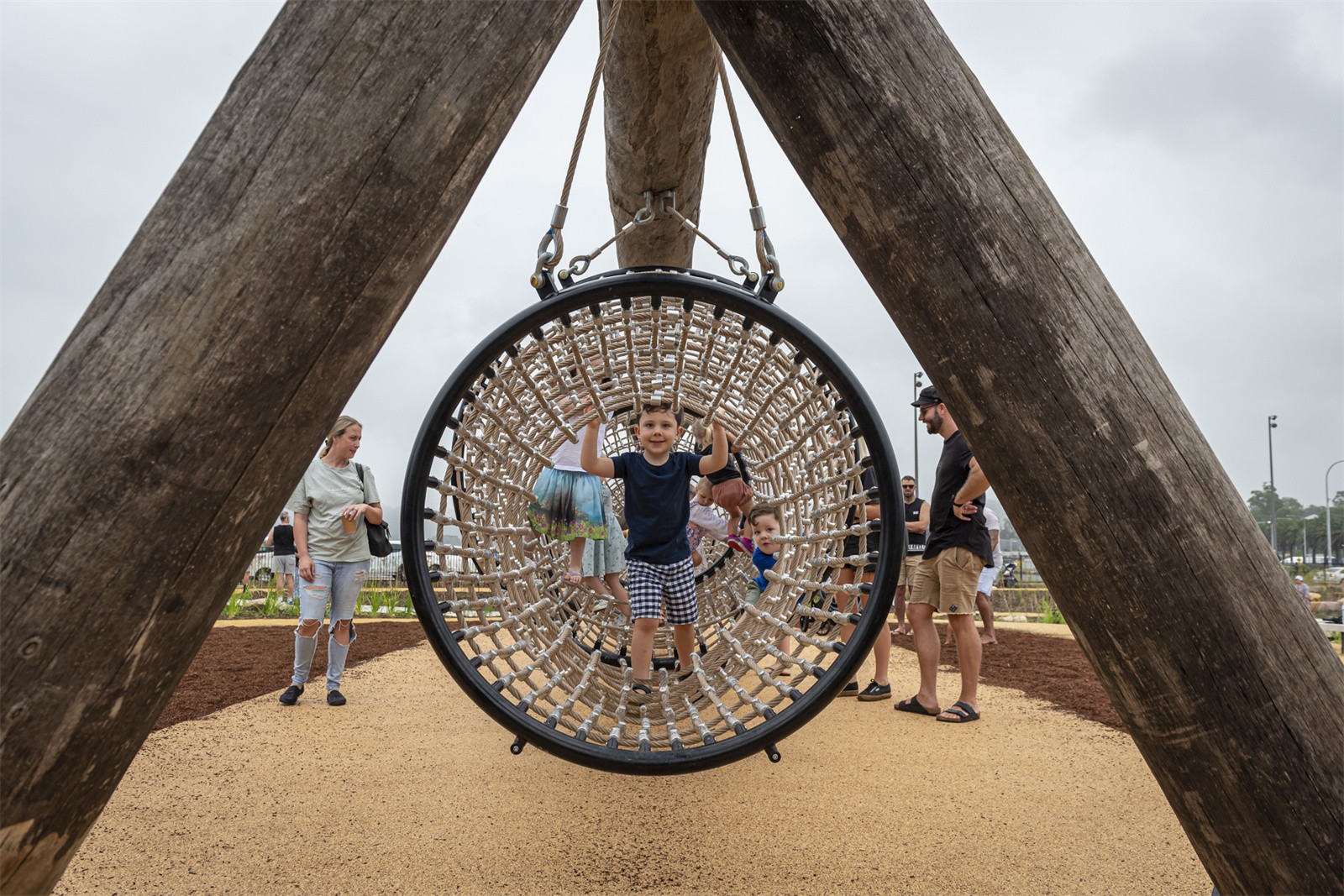 潮汐階地是設(shè)計(jì)中濃墨重彩的一筆,但公園里還有更多有趣之處。老少咸宜的游玩設(shè)施延伸到臨近空間。相鄰護(hù)堤頂部的“Seed Pod”游戲塔提供了廣闊的海灣景觀視野,以及充滿活力的自然游戲; “Fish Trap”是一種公共繩索裝置,當(dāng)它搖擺時,會帶來身臨其境、充滿想象的玩耍體驗(yàn)。