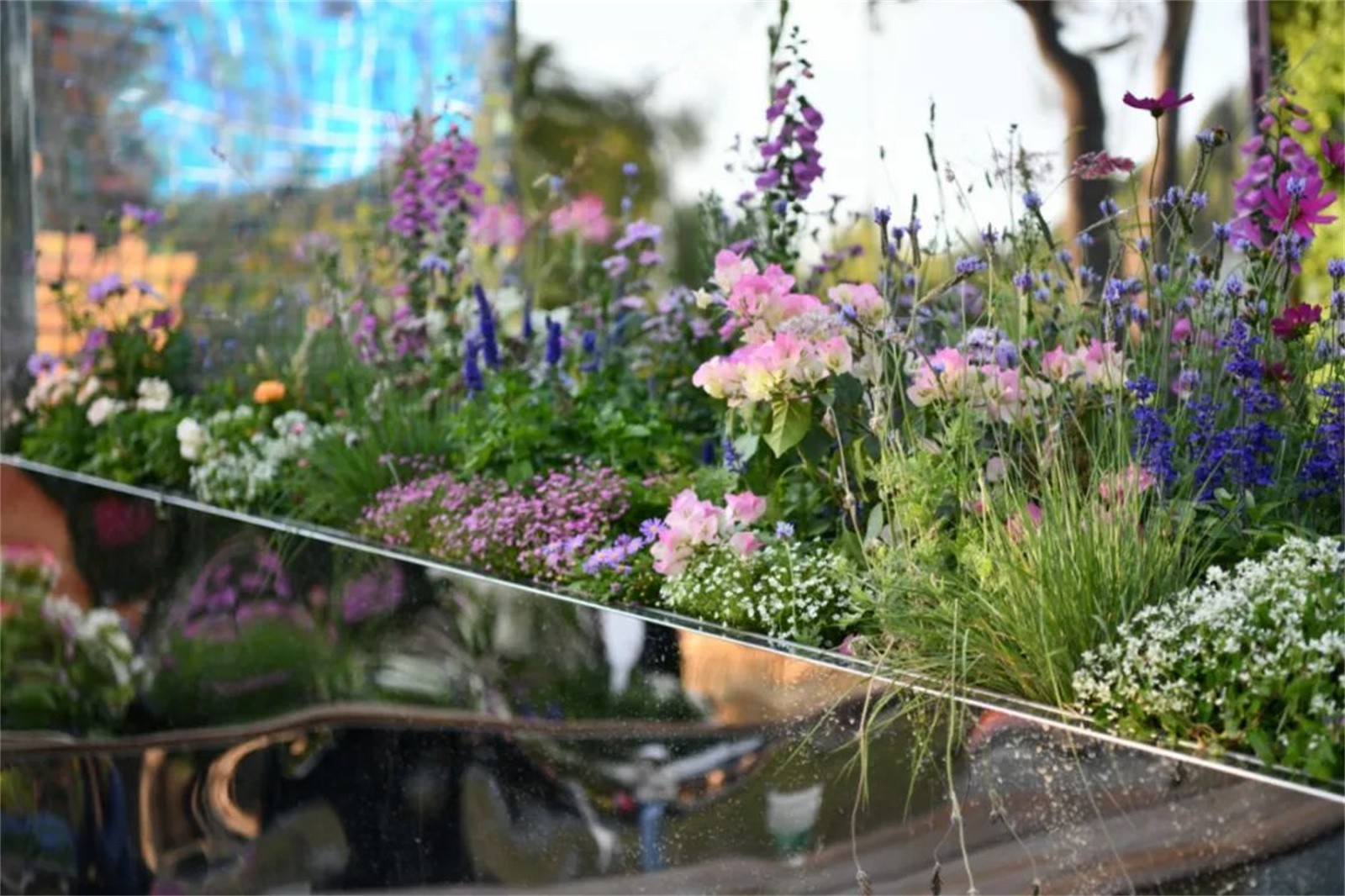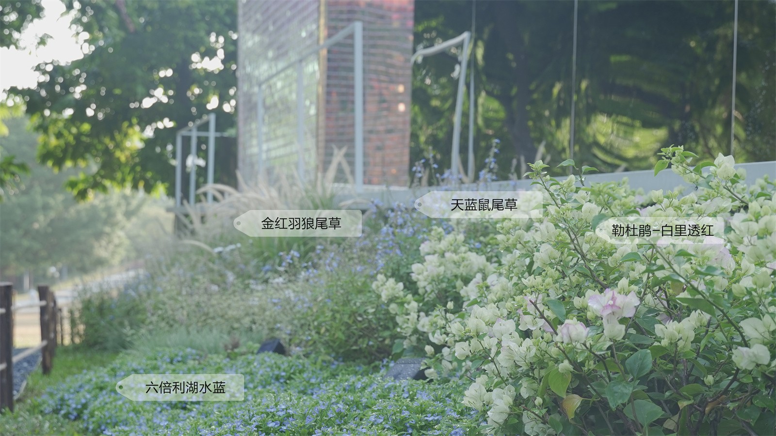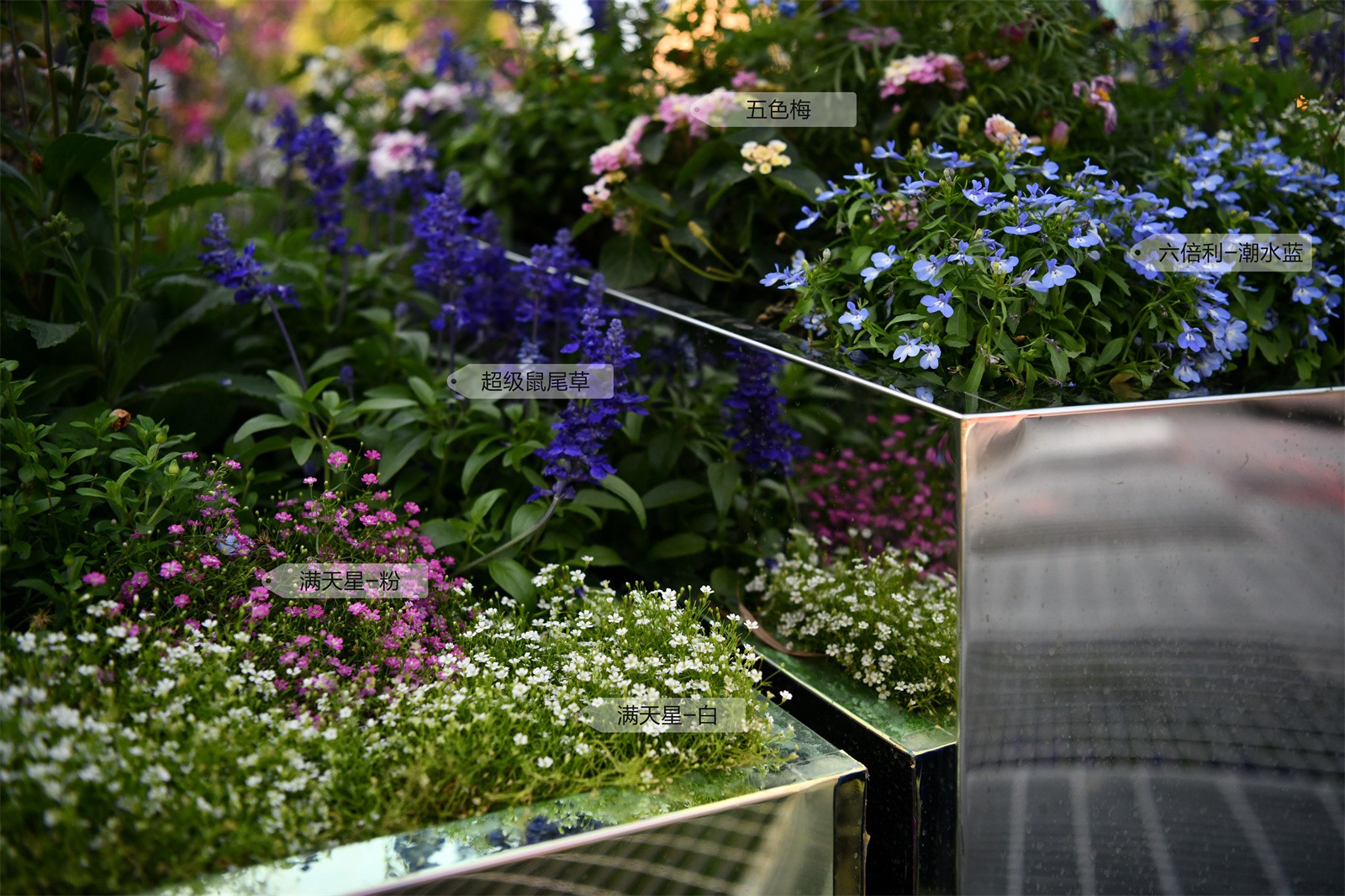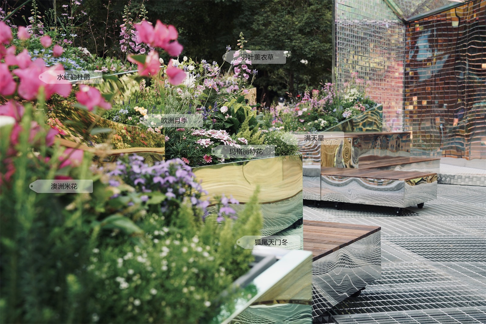 而花箱中采用了50多種多年生草本花卉及時(shí)花,是以淡粉色系為主配以藍(lán)、白色花卉等,打破組團(tuán)式花境的傳統(tǒng)手法,在通過(guò)精心配置的比例形成自然式的混種,擁有旺盛生命力的同時(shí)又不失其油畫般的藝術(shù)美感,而這種美不是固化而短暫的美,而是變化共創(chuàng)可再生的美。