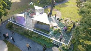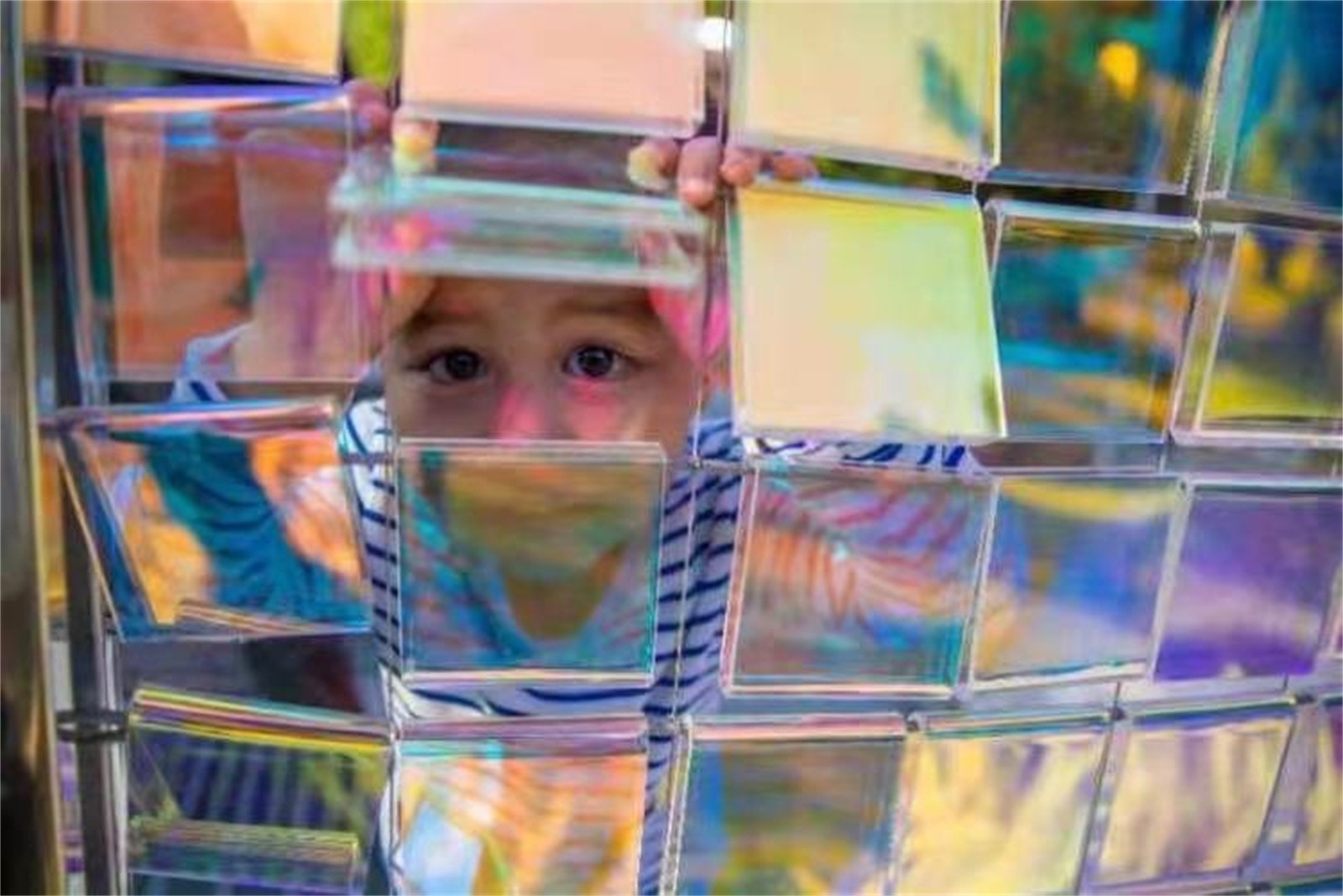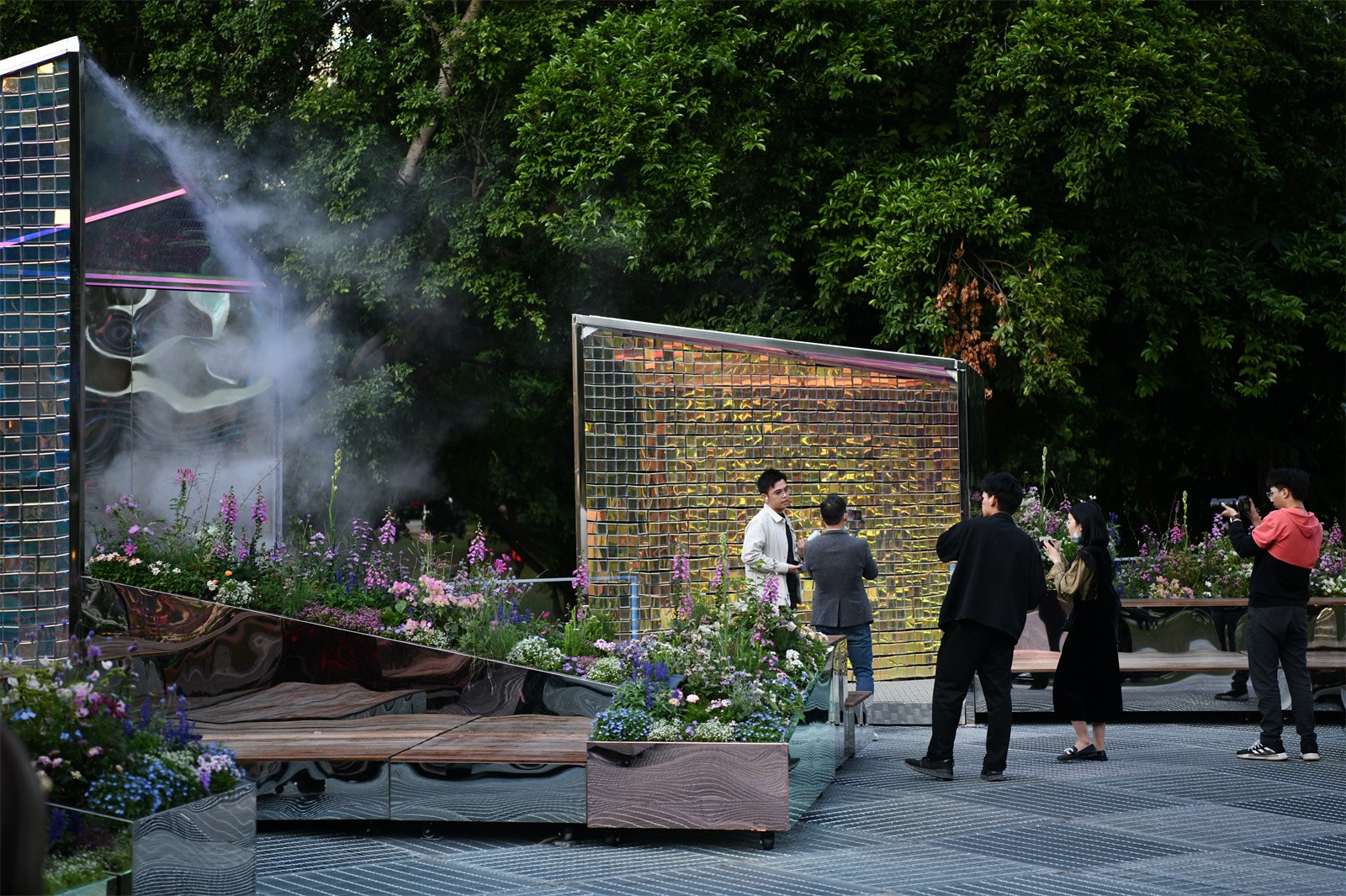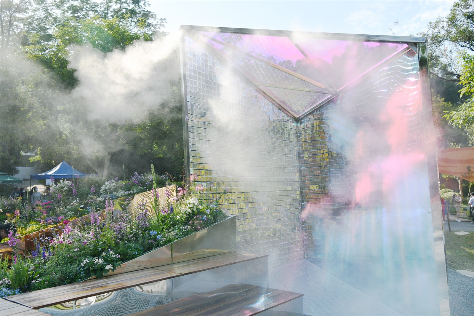 PLUG-IN GARDEN鋪拉格花園同時(shí)也是一個(gè)感官的花園,在花園中有三件藝術(shù)裝置,分別是光色、聲音與霧浴,其中光色之盒透過(guò)光的植入以大自然的光源為主要媒介的藝術(shù)形式讓場(chǎng)景美輪美奐,人們?cè)谧邉?dòng)時(shí)會(huì)看到光線折射出彩虹的七種顏色光,帶給市民愉悅的視覺享受和藝術(shù)體驗(yàn)。