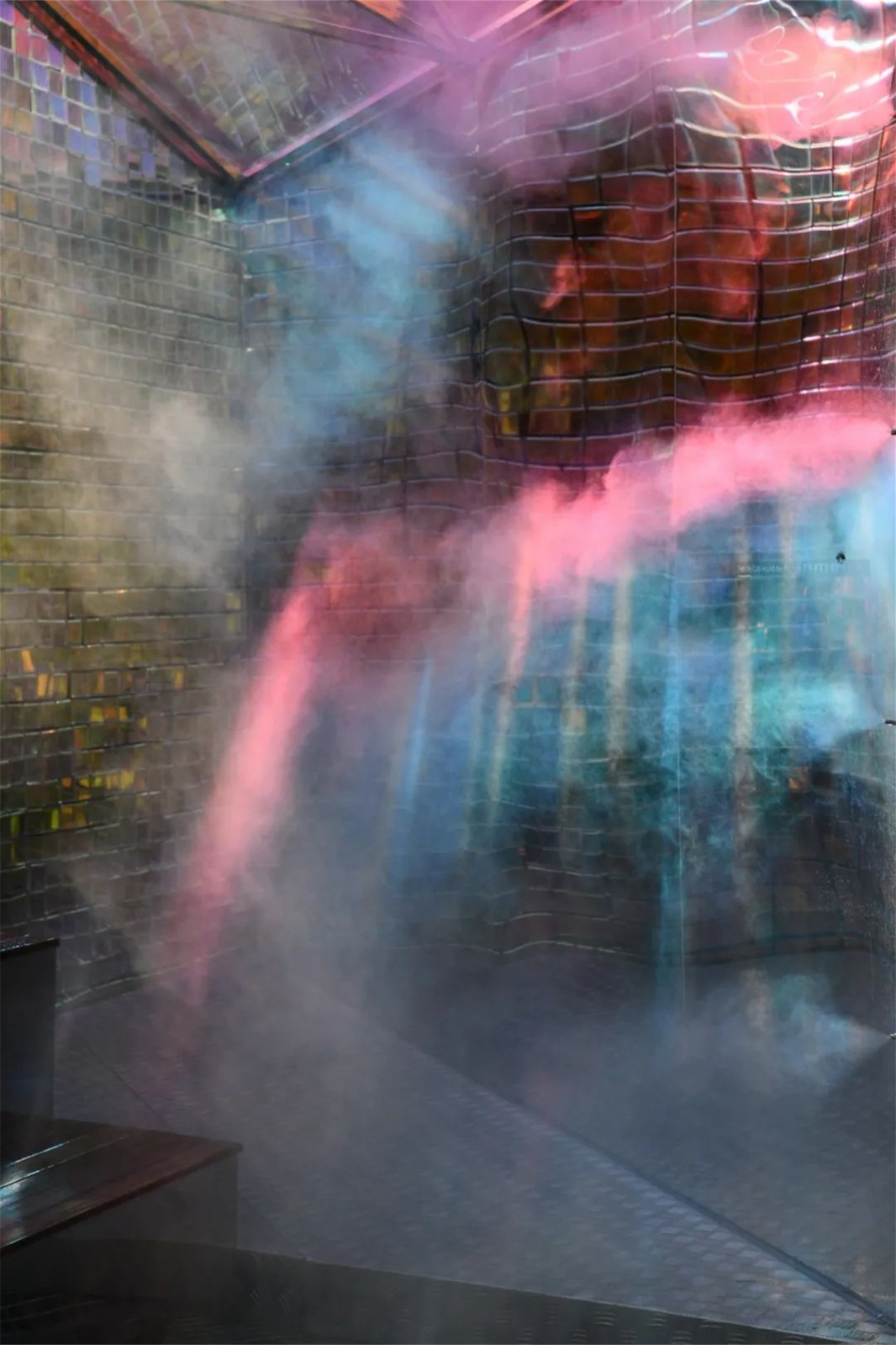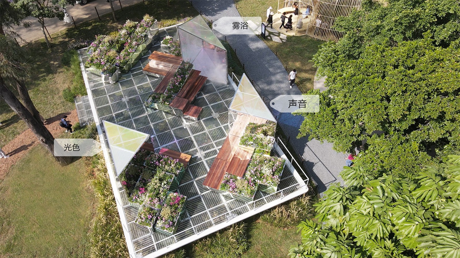 而沐浴之盒的“霧門”在風(fēng)與光的作用下散讓周圍恍如仙境的效果,讓市民仿佛感受著“沐浴”之感,經(jīng)歷身心的洗禮;當(dāng)夜幕降臨時(shí),“霧門”上的光讓霧浴之盒成為夜空中最閃耀的存在。通過(guò)花園中的聲、光、霧藝術(shù)裝置獲得多層次的體驗(yàn),在創(chuàng)新的環(huán)境里同樣能感受到城市的過(guò)去,羅湖的記憶。