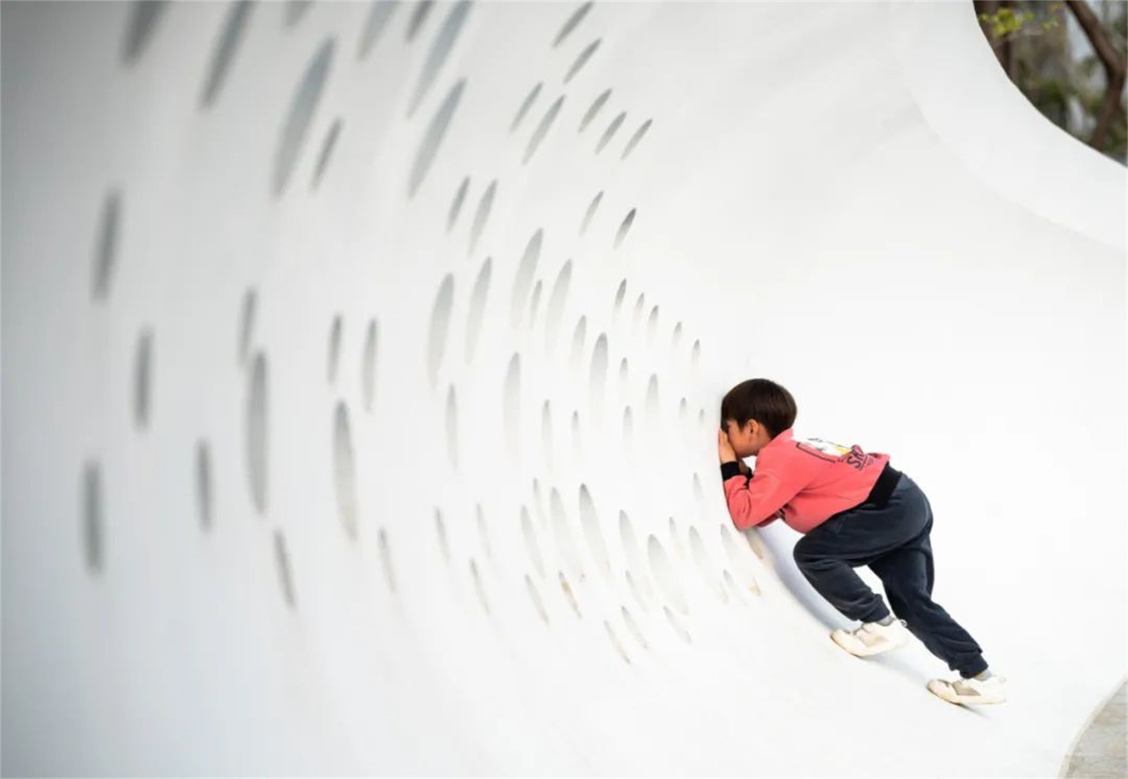 通過設(shè)計激發(fā)使用者的探索樂趣,傳遞低碳可持續(xù)價值。公園修復了1.5萬㎡破碎地表生境,讓裸露及硬化的土地重新自由呼吸。保留的263棵喬木及補種的192棵花喬木,每年吸收二氧化碳可達7.9噸。
