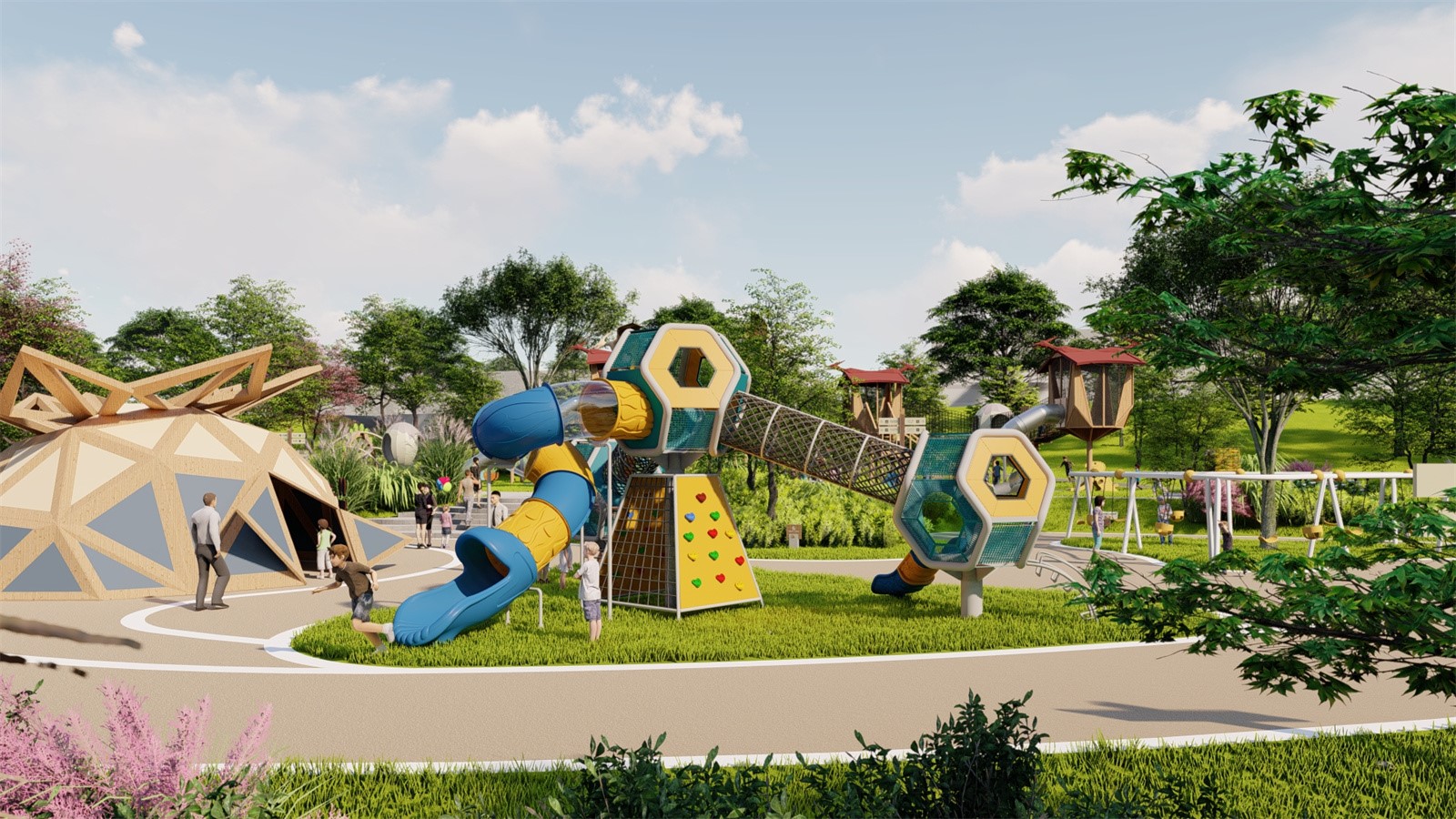 其中延吉龍呼啦墻、花朵傳聲筒、蹦床、恐龍蹺蹺板、組合秋千、塑木A字秋千是本設(shè)計方案里的重點,尤其是延吉龍呼啦墻和花朵傳聲筒,造型獨特優(yōu)美,周圍都是綠樹紅花,在這一片美麗的自然景色氛圍渲染下,仿佛回到了侏羅紀(jì)時代。