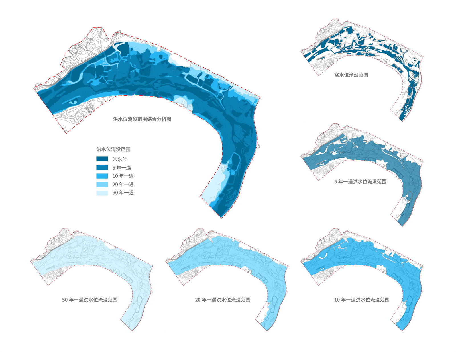 Comparison between the normal water level and flood level of the wetland in Caijiahe section - the level appears about once in five years, which has submerged most of the river beaches, and only some highlands in the west bank are exposed to the water ? 杭州園林設(shè)計(jì)院股份有限公司