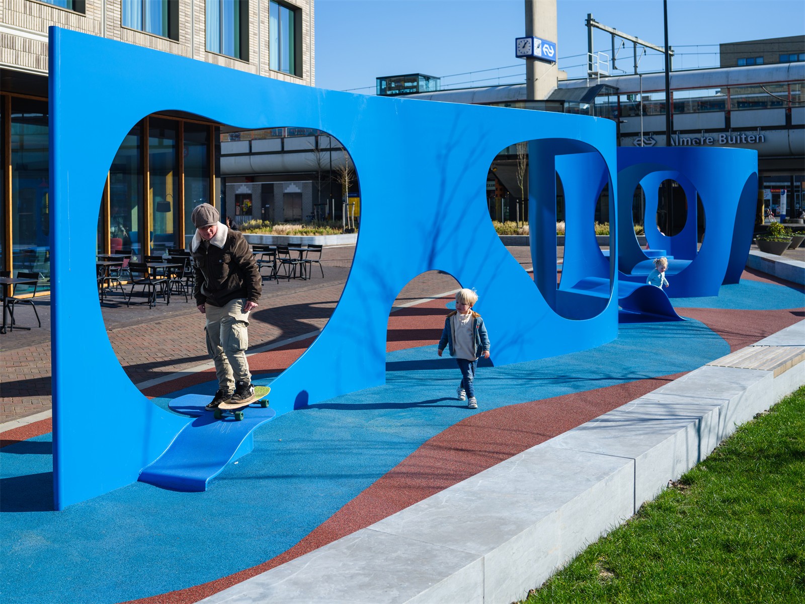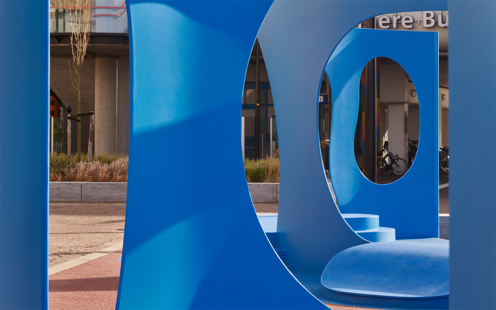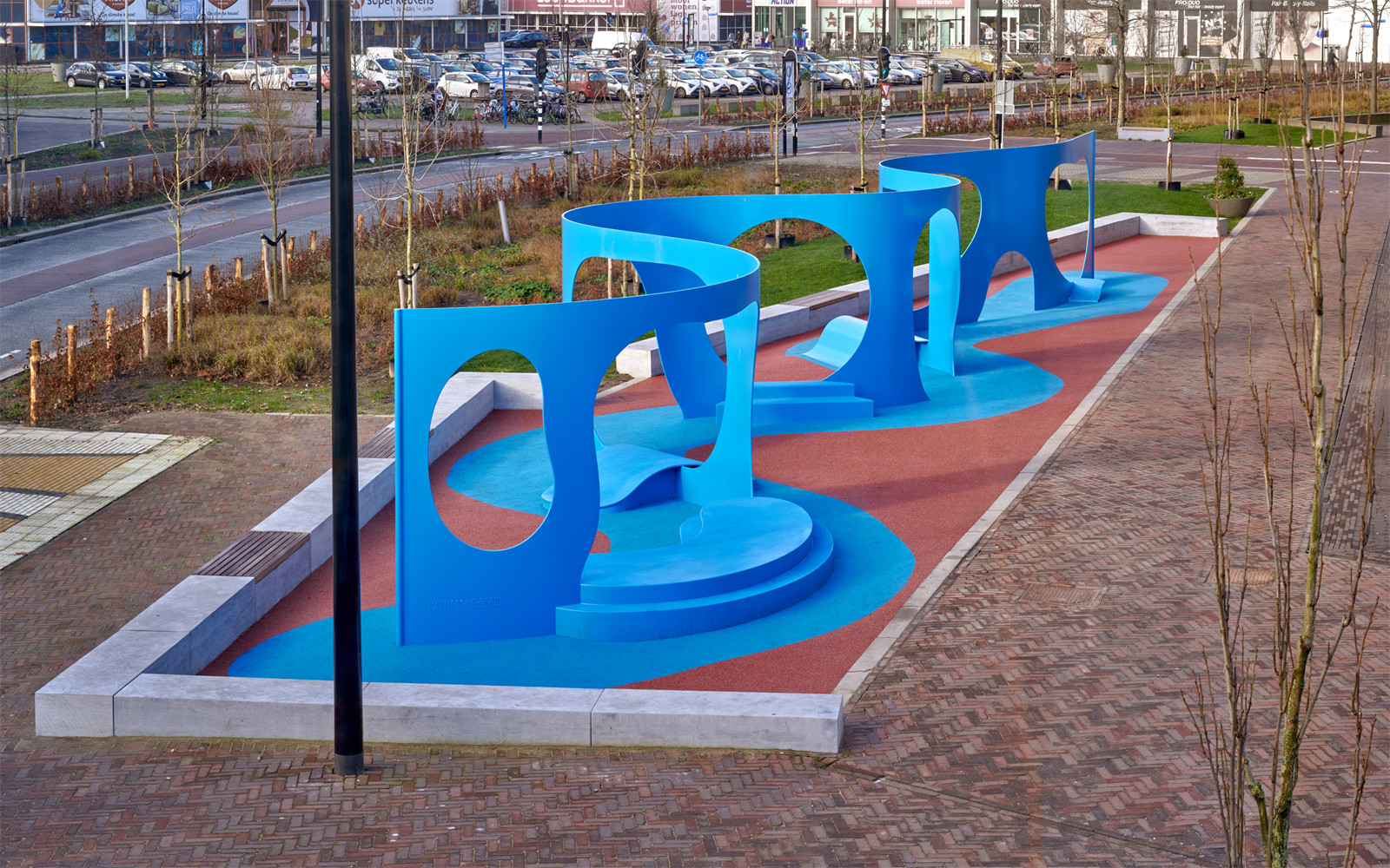 The organic shape with its cut outs are inspired by the city of Almere: her colorful and experimental architecture,the water of Almere and the diversity of the city and her inhabitants. The blue color is therefore a reflection of the water and color samples taken from the neighborhood. Besides this, the applied artwork is more than just a playground for children; the artwork serves multiple functions for diverse target groups. For young people, elderly, disabled and visitors of Almere Buiten, the renewed Baltimore Square acts as a meeting place, sporting venue and recreational hub. Baltimore Bend has something for everyone!
