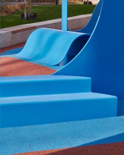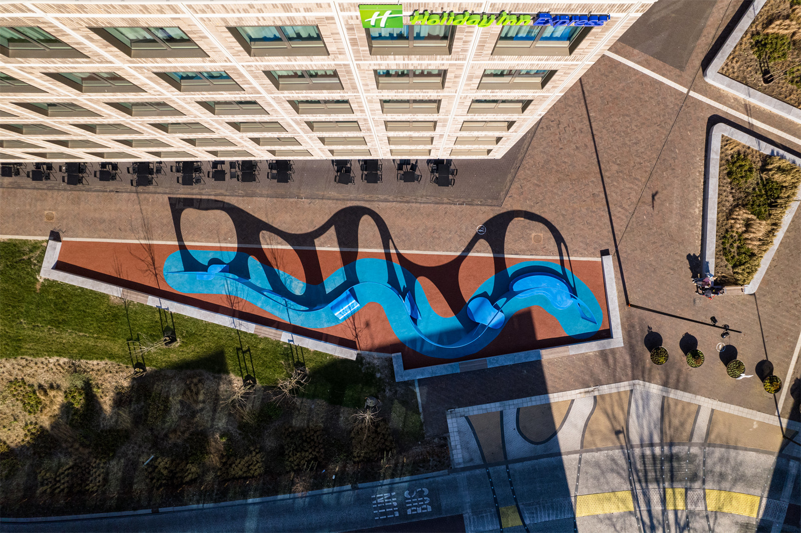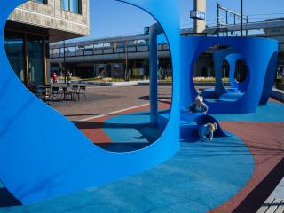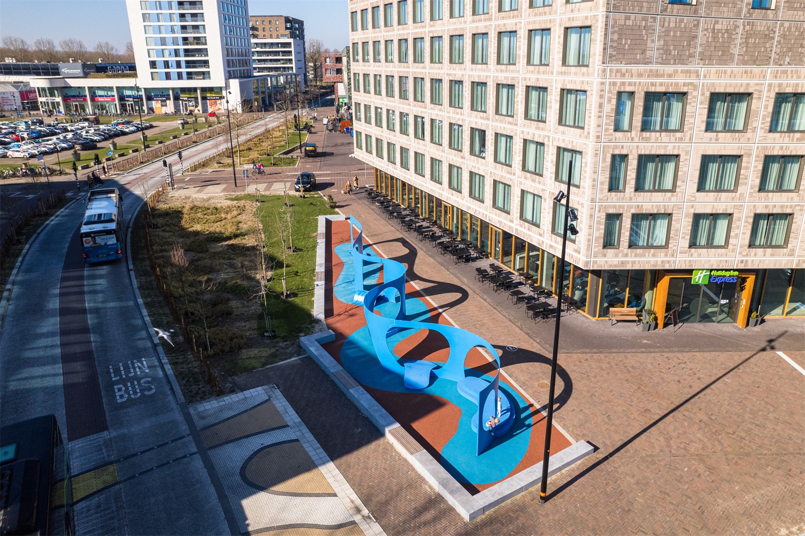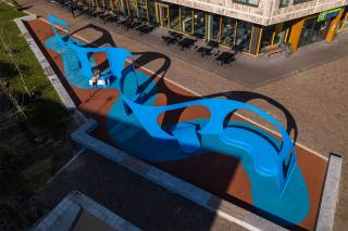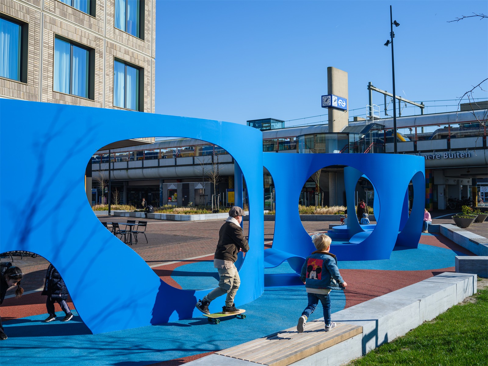 The organic shape with its cut outs are inspired by the city of Almere: her colorful and experimental architecture,the water of Almere and the diversity of the city and her inhabitants. The blue color is therefore a reflection of the water and color samples taken from the neighborhood. Besides this, the applied artwork is more than just a playground for children; the artwork serves multiple functions for diverse target groups. For young people, elderly, disabled and visitors of Almere Buiten, the renewed Baltimore Square acts as a meeting place, sporting venue and recreational hub. Baltimore Bend has something for everyone!