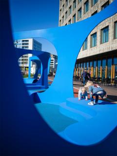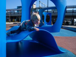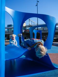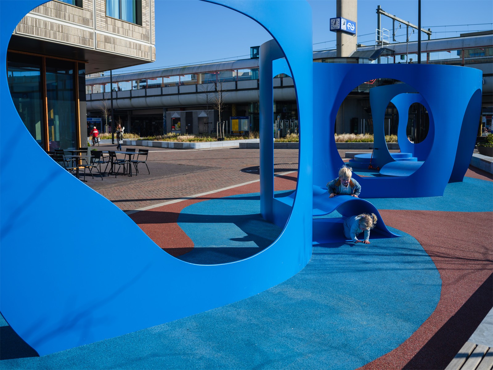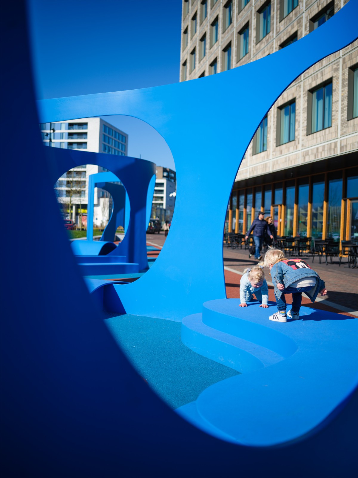 Through the curved shape and perforations in the brightly colored steel construction, a playful and interesting route is created which invites for exploration of different areas. The abstract and innovative design stimulates children to use their fantasy and creativity to make their own play environment. The open shape of the artwork ensures a clear view for parent and child and connects the artwork with its direct urban surroundings.