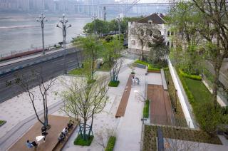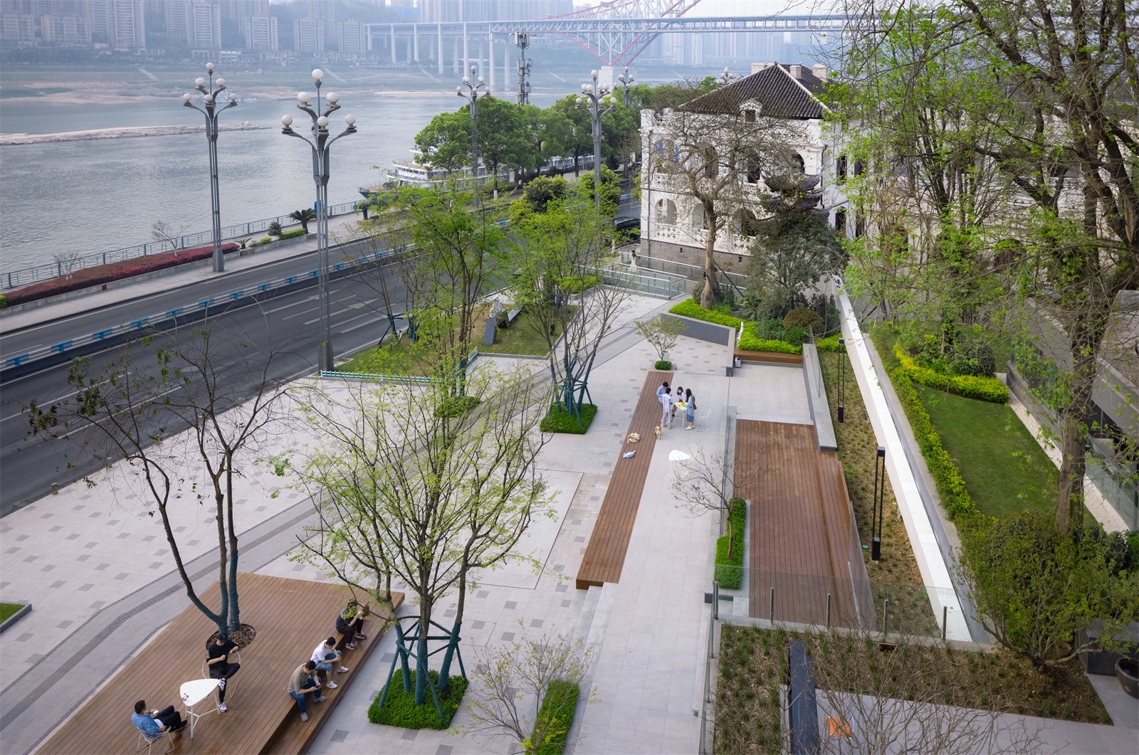 從水師兵營、社區(qū)口袋公園到前場的展示區(qū),歷史敘事,精裝巧思。前場運用借景技巧,巧妙把江岸對面的重慶地標建筑朝天門來福士、重慶大劇院納入視野之內,形成兩岸景色聯(lián)動。