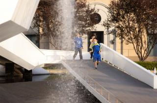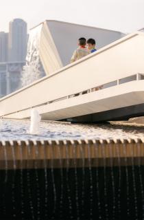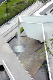 飛橋、懸瀑運用城市的山水元素,凸顯出前場昭示性,奠定場地現(xiàn)代自然的風格和藝術基調,和后場形成時間上的呼應。