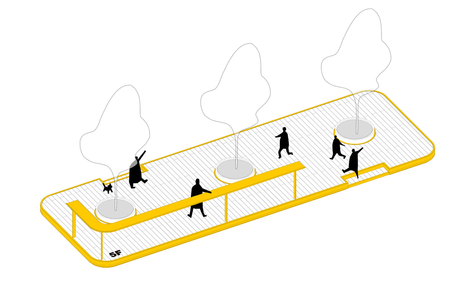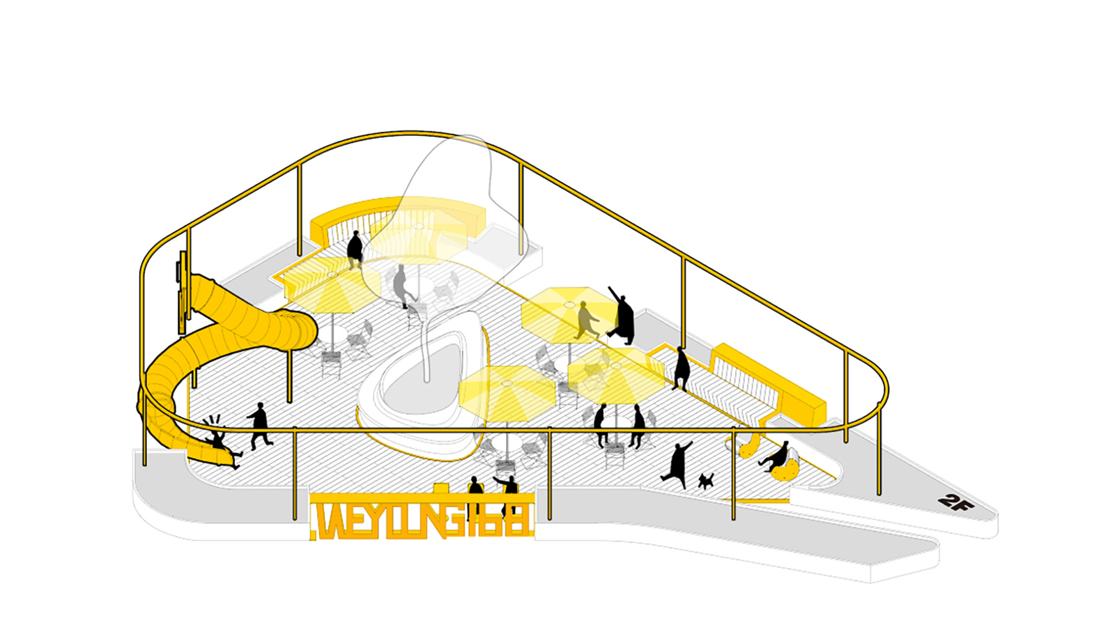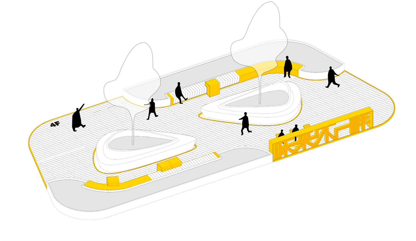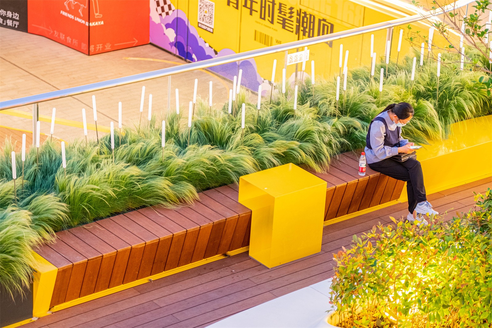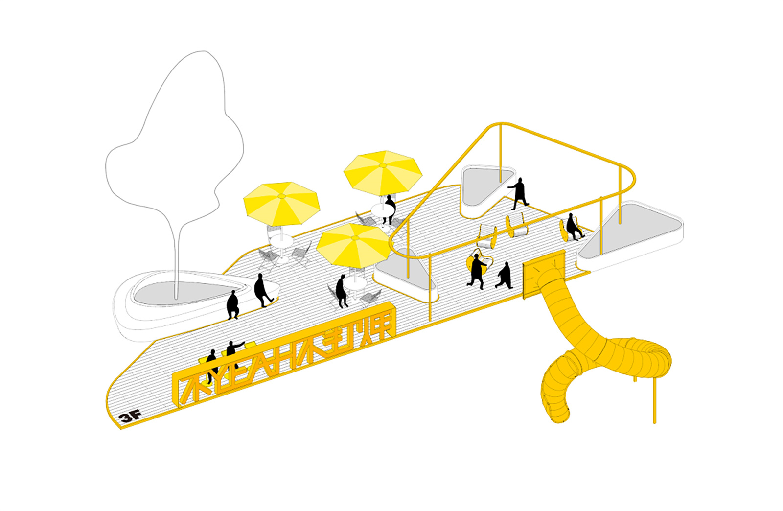 In terms of color, we boldly chose bright yellow, which is completely different from the building. It makes the landscape facilities more prominent and further enhanced their "prefabricated" appearance. At the same time, the bright yellow also makes each small space more light, warm and pleasant, forming an escape in the cold architectural atmosphere.