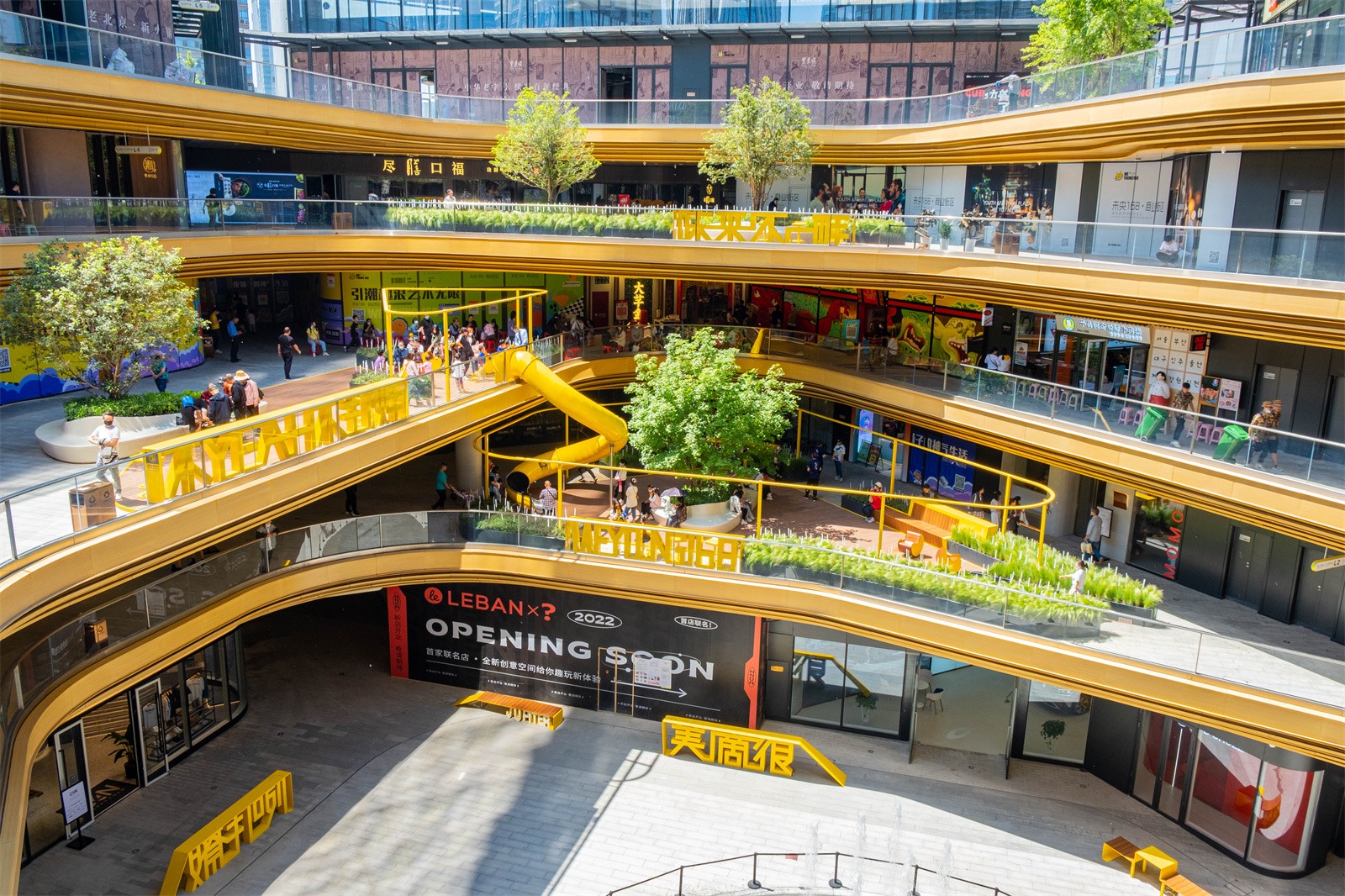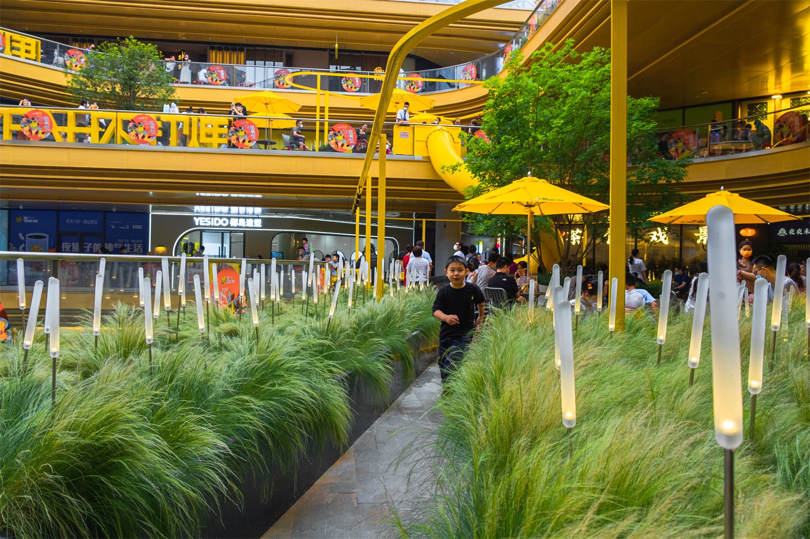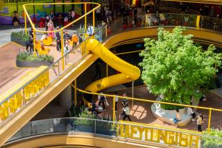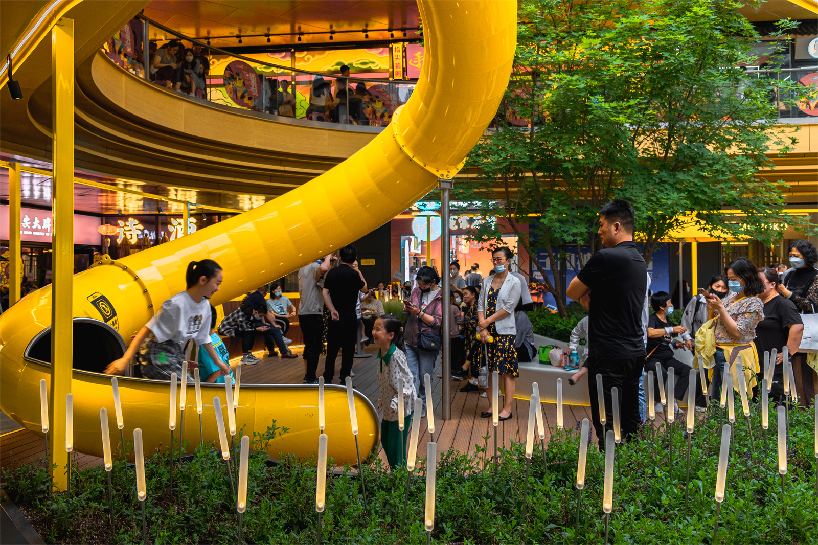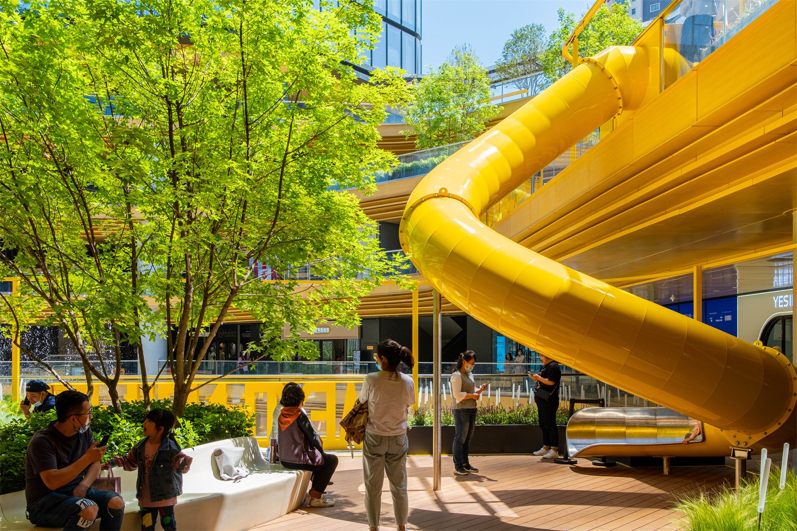The key to commercial landscape design is to better promote circulations and guide people into different commercial areas. The ground level usually has the biggest business opportunities. In order to attract people to the higher floors, we introduced a rotating slide between the 2nd and 3rd floor, making it a popular interactive spot.