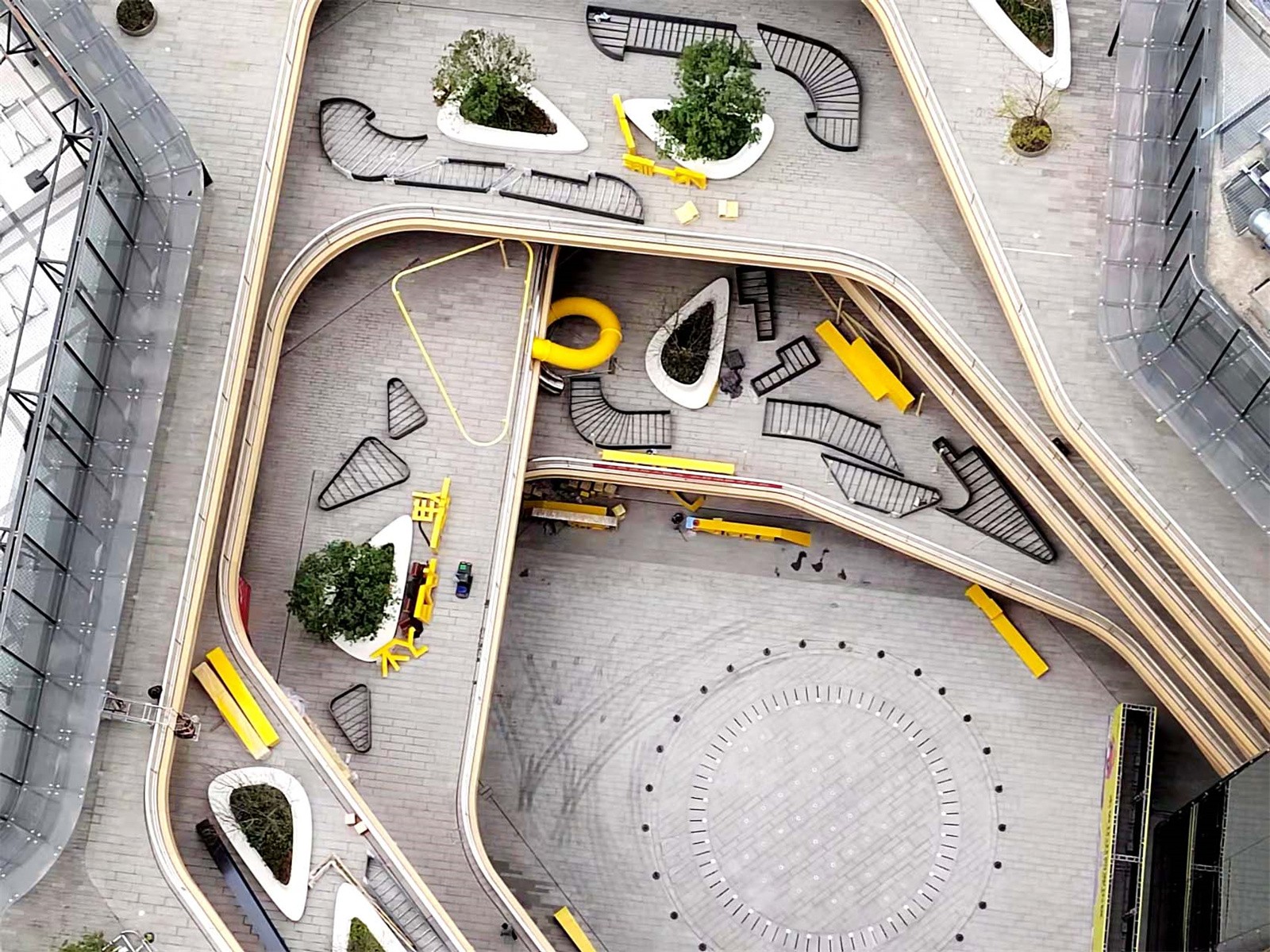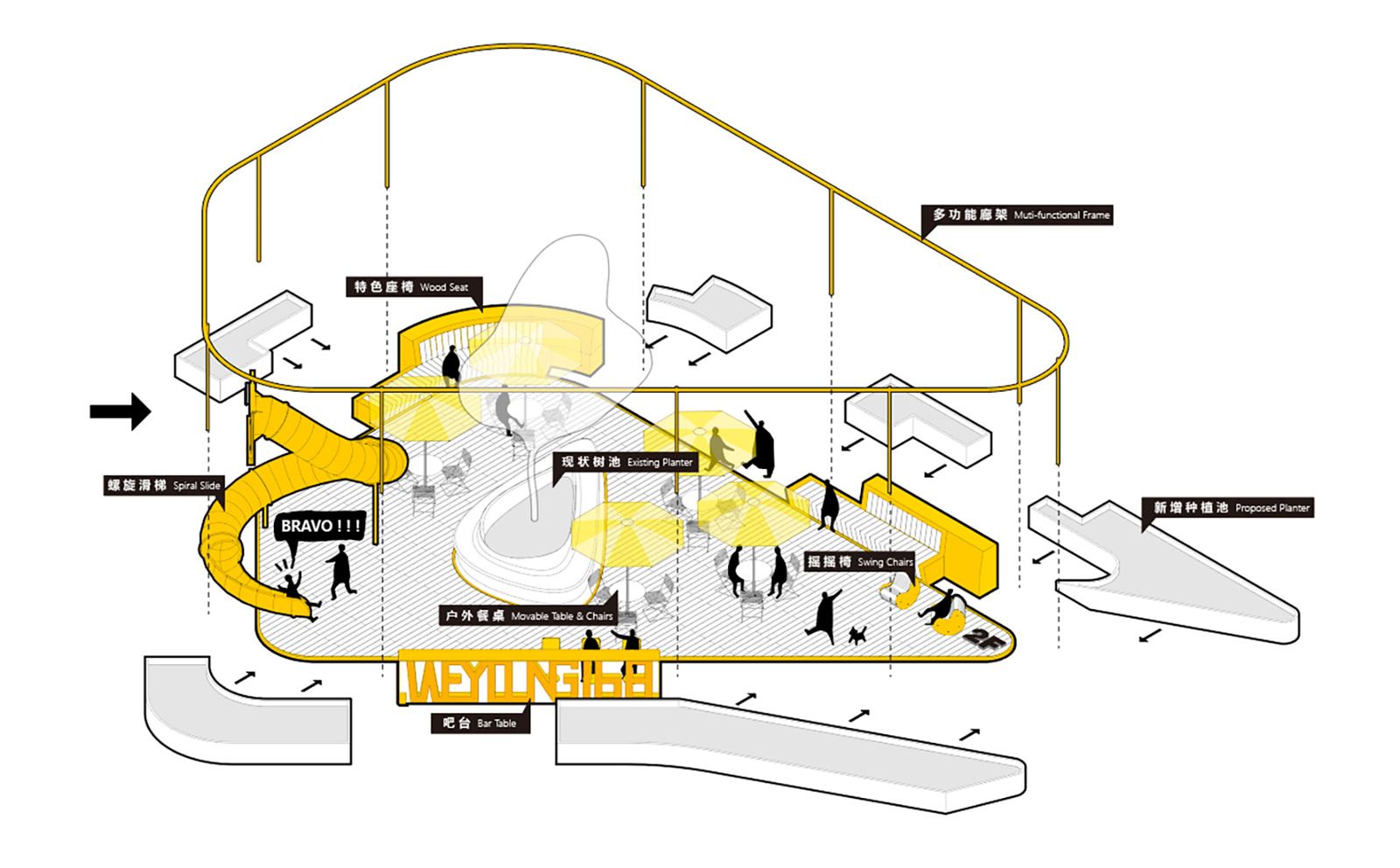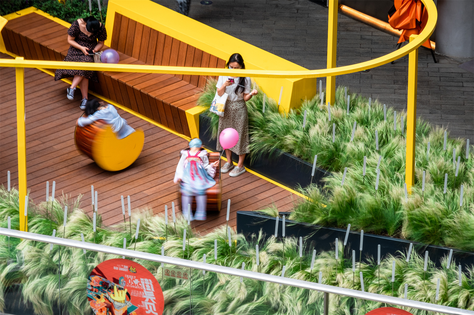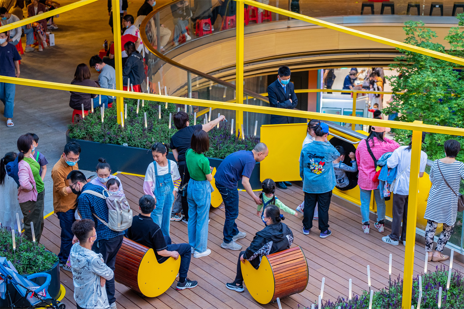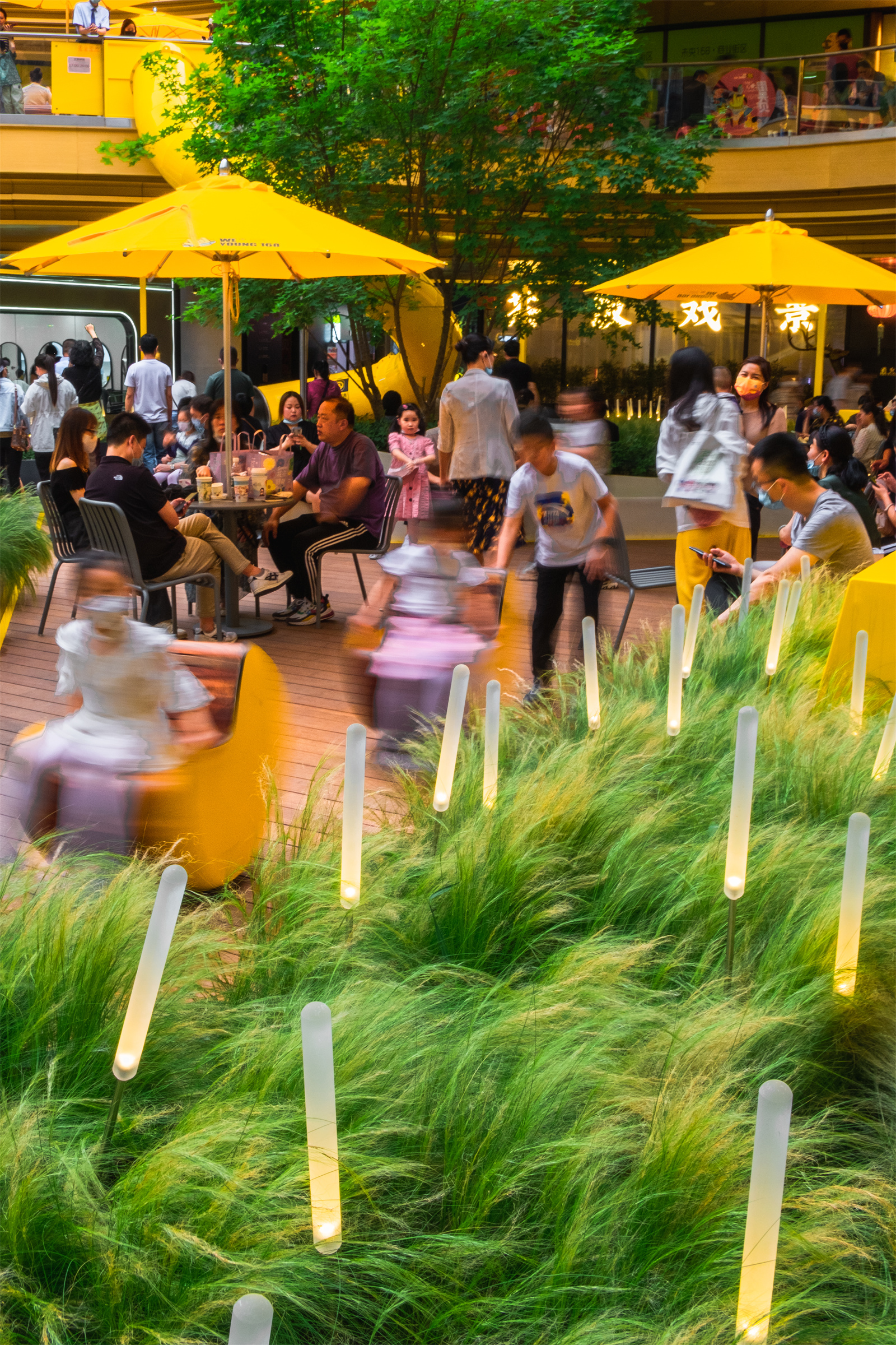 The key to commercial landscape design is to better promote circulations and guide people into different commercial areas. The ground level usually has the biggest business opportunities. In order to attract people to the higher floors, we introduced a rotating slide between the 2nd and 3rd floor, making it a popular interactive spot.