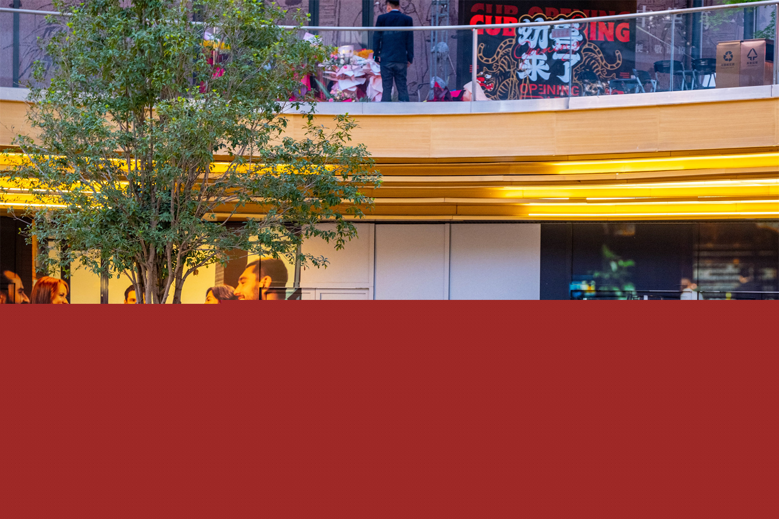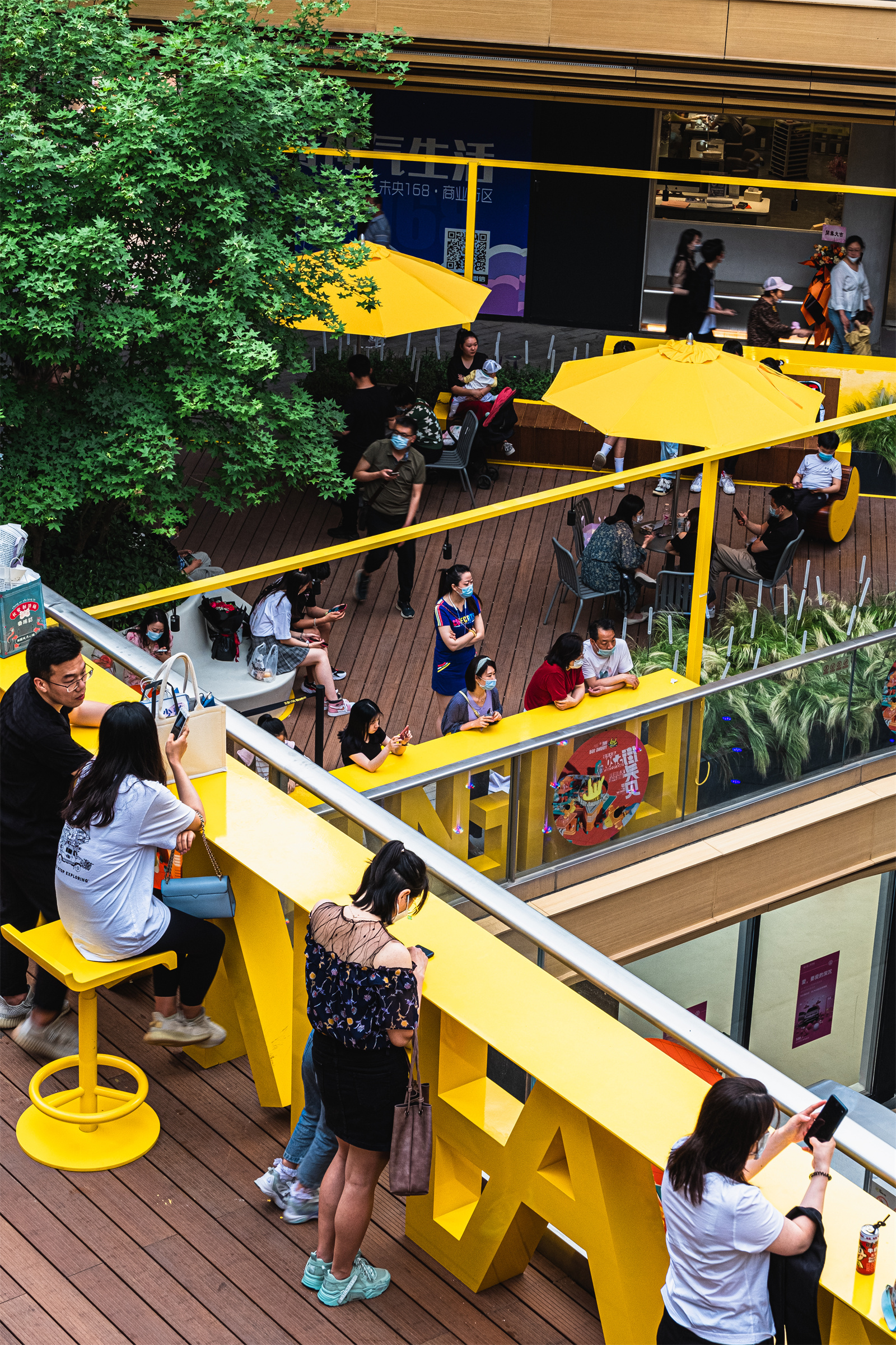 In addition, we also incorporated some Chinese characters into the bar tables. On the one hand, because people are highly sensitive to characters, they can be attracted in an instant; on the other hand, it adds interests to each terrace space. Also, it creates nodes for people to take photos and celebrate on their social media.