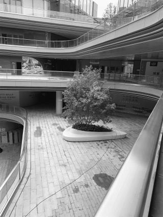 已建成的建筑極具流線形和科技感,在現(xiàn)場具有無可爭辯的壓迫感。由建筑師設(shè)計的景觀空間強調(diào)宏大敘事與整體協(xié)調(diào),雖然營造了大面積的戶外露臺作為交通和活動區(qū)域,由于視角仍然是“建筑”而導(dǎo)致這些露臺區(qū)域大而空曠。這些露臺空間在設(shè)計之初是想為商業(yè)和運營提供足夠的靈活度,然而落成之后面對這些空曠的露臺,甲方和運營方卻都無從下手。顯然這些室外露臺空間缺乏定義,在建筑空間與運營使用之間缺少了一個重要的細化設(shè)計環(huán)節(jié)——商業(yè)景觀細化設(shè)計。