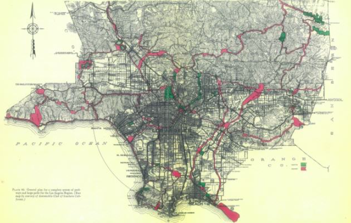 1930年,奧姆斯特德兄弟事務所(the Olmsted Brothers)與哈蘭德·巴斯洛繆聯(lián)合公司(Harland Barthlomew and Associates)曾一起為洛杉磯制定規(guī)劃,設想了以洛杉磯河等河流為綠道“骨干”的大約287km2的公園綠地。洛杉磯歷史學家威廉·德弗雷爾(William Deverell)曾寫道,該規(guī)劃中存在一個致命問題——巨大的規(guī)劃成本意味著需要形成新的治理結構,而這會損害當地商會的已有權力。因此,該規(guī)劃沒有任何實質性進展。