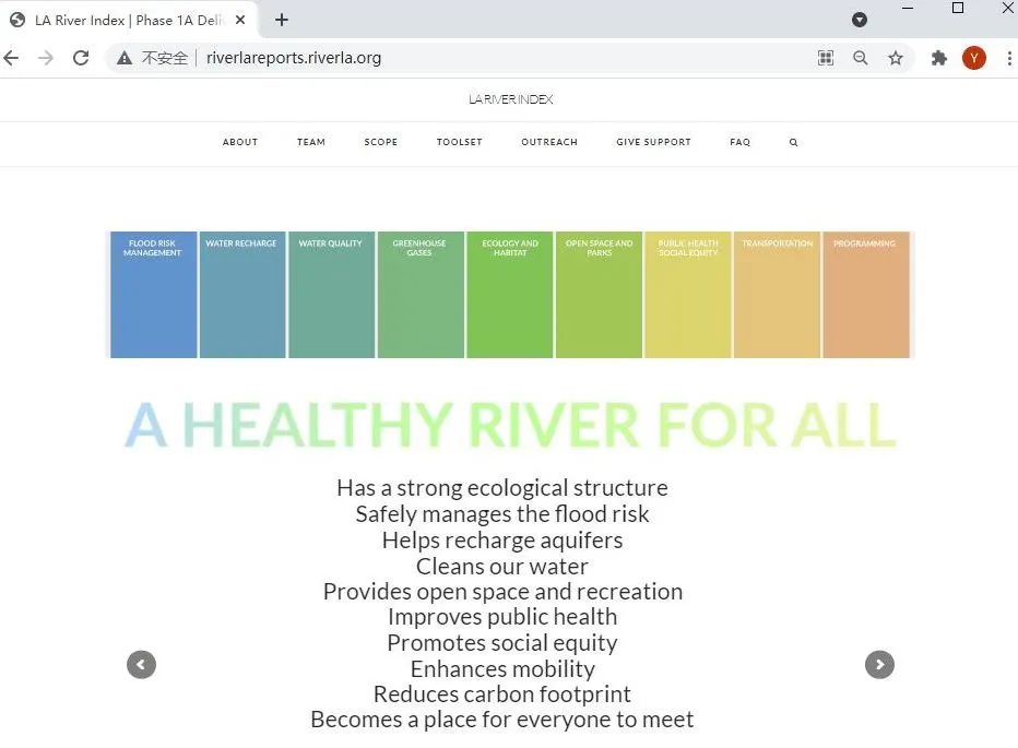 2014年與2015年,在非營利組織River LA的領導下,歐林事務所(OLIN)、蓋里建筑事務所(Gehry Partners)與Geosyntec跨國工程咨詢公司合作開展了一項公益性的深度研究。2016年,該研究建立了洛杉磯河索引網站(LA River Index),這是一個致力于收集洛杉磯河數據的網站。