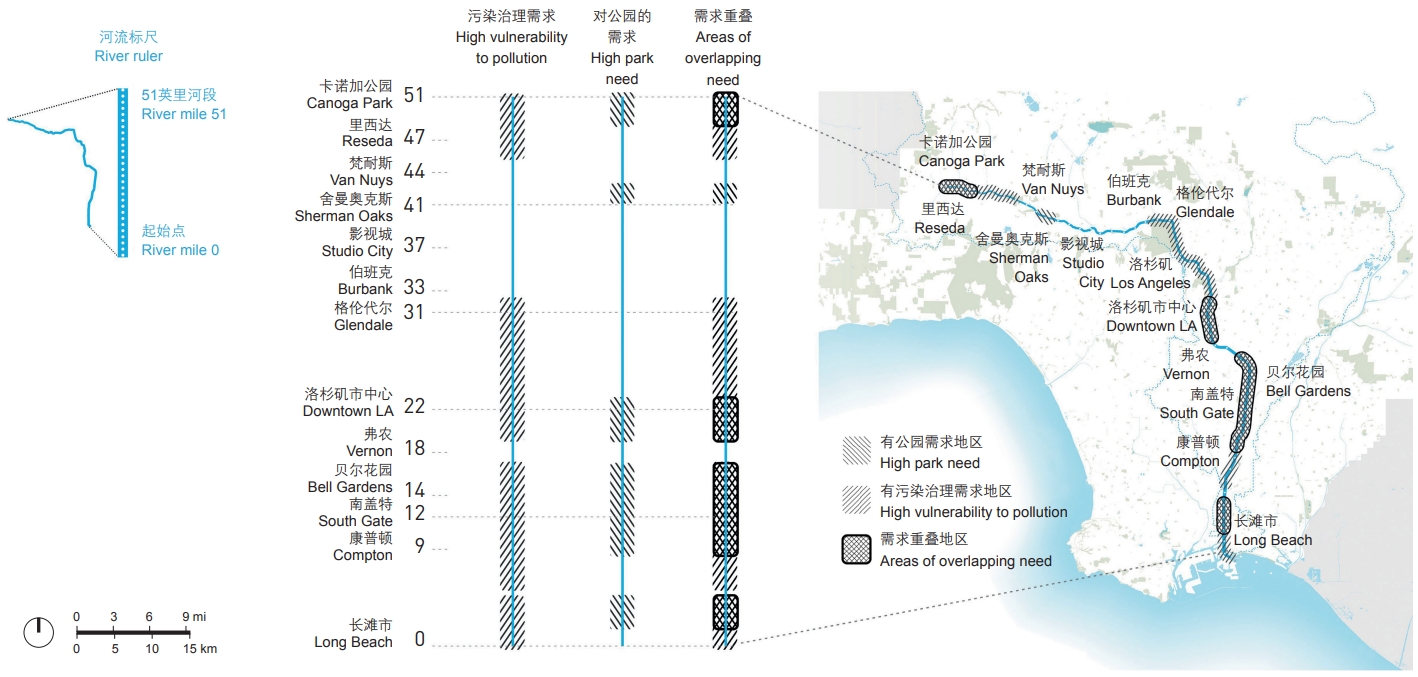 洛杉磯河標尺系統(tǒng)是對洛杉磯河進行線性解讀的一個系統(tǒng)。規(guī)劃團隊使用地理信息系統(tǒng)圖像與線性參考沿標尺投影的數據,以此得到了200多個基于洛杉磯河數據庫的標尺集。根據這些數據,團隊最終制定出9張響應總體規(guī)劃目標的需求地圖,直觀地顯現了需求最高的社區(qū)。