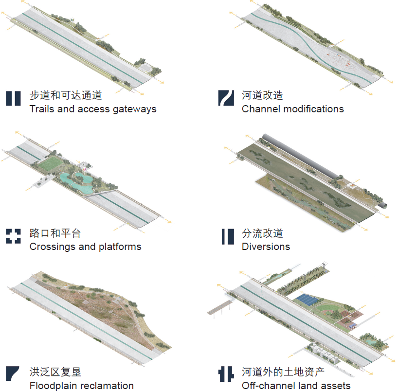 規(guī)劃團隊意識到創(chuàng)造完整的濱河生態(tài)系統(tǒng)會占用比現有河道寬3~7倍的用地,以及將20000~100000人的私有房地產與許多關鍵的基礎設施進行大規(guī)模搬遷并不現實。因此,總體規(guī)劃提出了“工具包”(kit of parts)的概念,包含了6種可行的設計原型,以面向不同的地理區(qū)位與需求?!肮ぞ甙敝信渲昧?5種設計組件,成為了洛杉磯縣沿著河流廊道與支流開展建設的設計指南。