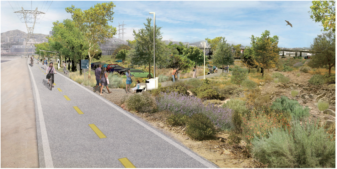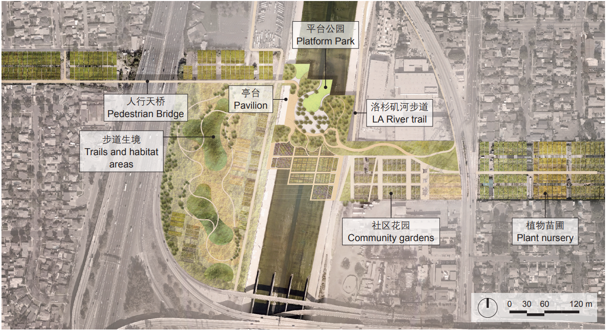 隨著城市化逐漸推進,洛杉磯河為降低洪水發(fā)生風險而被渠化。洛杉磯河的通行權范圍內有超過930多公頃的公共用地可以用來重塑洛杉磯河,這將會影響河道周圍1.6km范圍內100萬人的生活。洛杉磯河總體規(guī)劃是由洛杉磯縣主導,面向未來25年的基于數據的規(guī)劃。該規(guī)劃提議建設長約51英里(約82km)相互連接的公共開放空間,其中包括一系列多效益項目,共響應了9個總體目標,從防洪韌性到房屋經濟實用性,再到生態(tài)功能、藝術、教育和文化等。其中一項針對全流域的研究,致力于記錄和理解水質、水源地保護與洪水風險等話題。規(guī)劃還提出了包含棲息地橋梁、干旱河谷側渠等在內的65種設計“工具包”,旨在提升生態(tài)系統(tǒng)服務、形成一個欣欣向榮的城市居所和相互連接的濱河公園網絡。