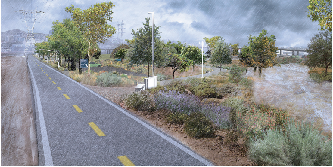 暴雨天氣時的河谷側渠 ? LA River Master Plan 2021, LA County Public Works, Geosyntec, OLIN, Gehry Partners