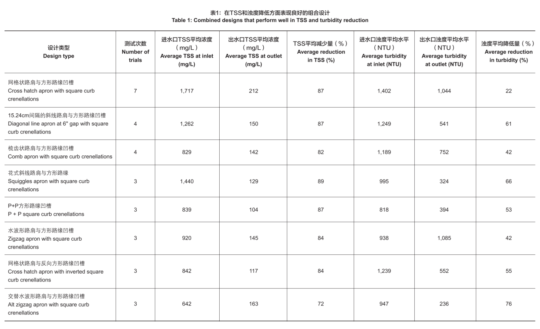 研究發(fā)現(xiàn),同時(shí)改造路緣和路肩的組合設(shè)計(jì)比單獨(dú)改造路緣或路肩的設(shè)計(jì)效果更好。本研究提出的8種組合設(shè)計(jì)中有7種達(dá)到或超過了TSS降低量不得低于80%的要求,它們?cè)跍y(cè)試中的具體數(shù)據(jù)表現(xiàn)如下。