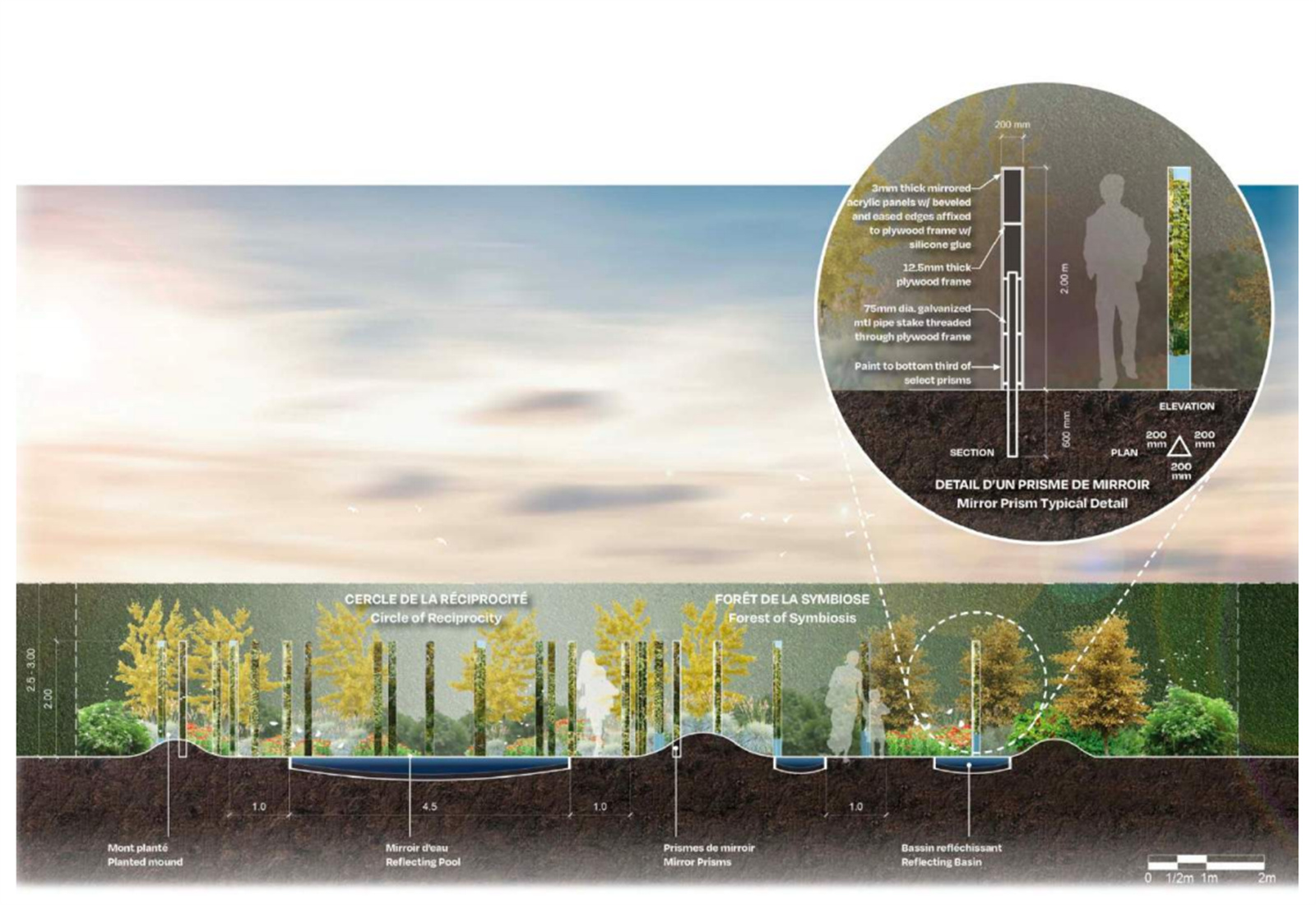 In the center of the garden, visitors arrive at a clearing – the Circle of Reciprocity, where mutual relationships between humans and nature come into focus. In a meditative space that is both intimate and communal, visitors discover that the field of prisms are arranged in concentric arrays to face a central reflecting pool. Surrounded by their own reflections in nature, visitors become aware of the reciprocal relationship between themselves and the natural world. Lines are blurred between humans and nature, and we realize everything is interconnected.