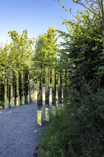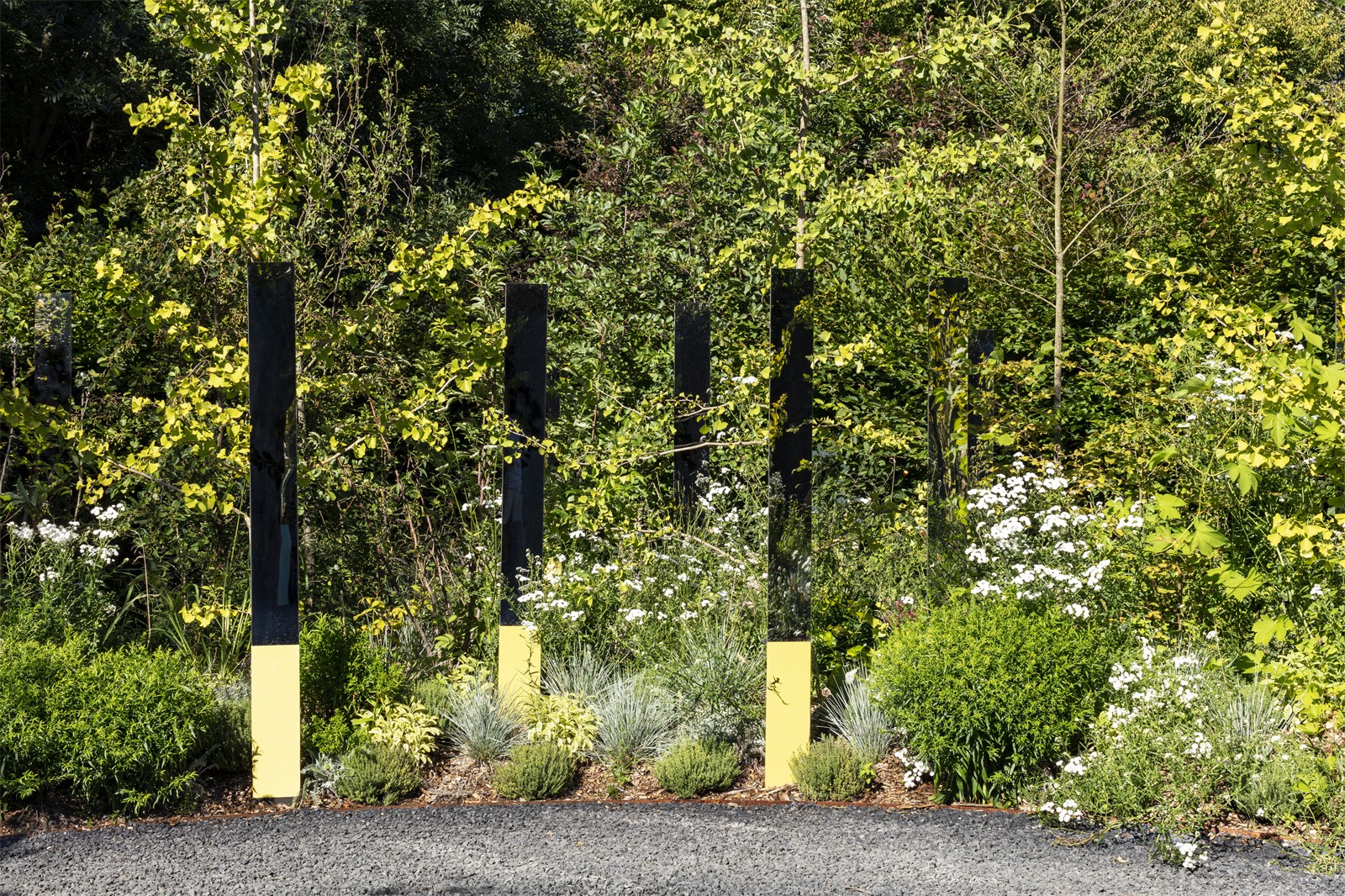 Upon arrival to the garden, visitors pass through a portal composed of prismatic mirrored pillars which reflect the visitors while framing the landscape beyond. Here visitors begin their journey with a sense of being separate from but enchanted by nature.