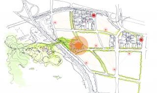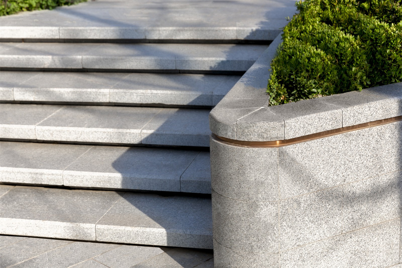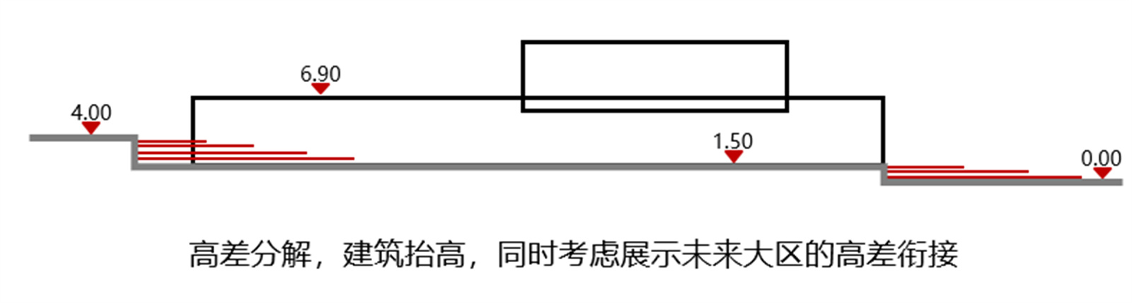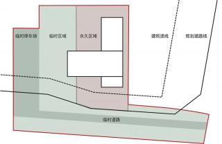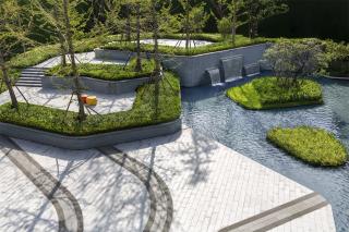 因規(guī)劃開發(fā)而分割成具有限制的混合地塊,設(shè)計(jì)師充分考慮了最大化銷售期的景觀效果,同時(shí)形成與遠(yuǎn)期社區(qū)功能順應(yīng)銜接的綜合方案。示范區(qū)本身是大區(qū)東部的構(gòu)成部分,毗鄰城市街道具有四米高差,設(shè)計(jì)中提前考量了未來(lái)大區(qū)入口使用的限制,將難得的豎向變化因循利導(dǎo),形成豐富的,具有節(jié)奏感的疊進(jìn)空間。