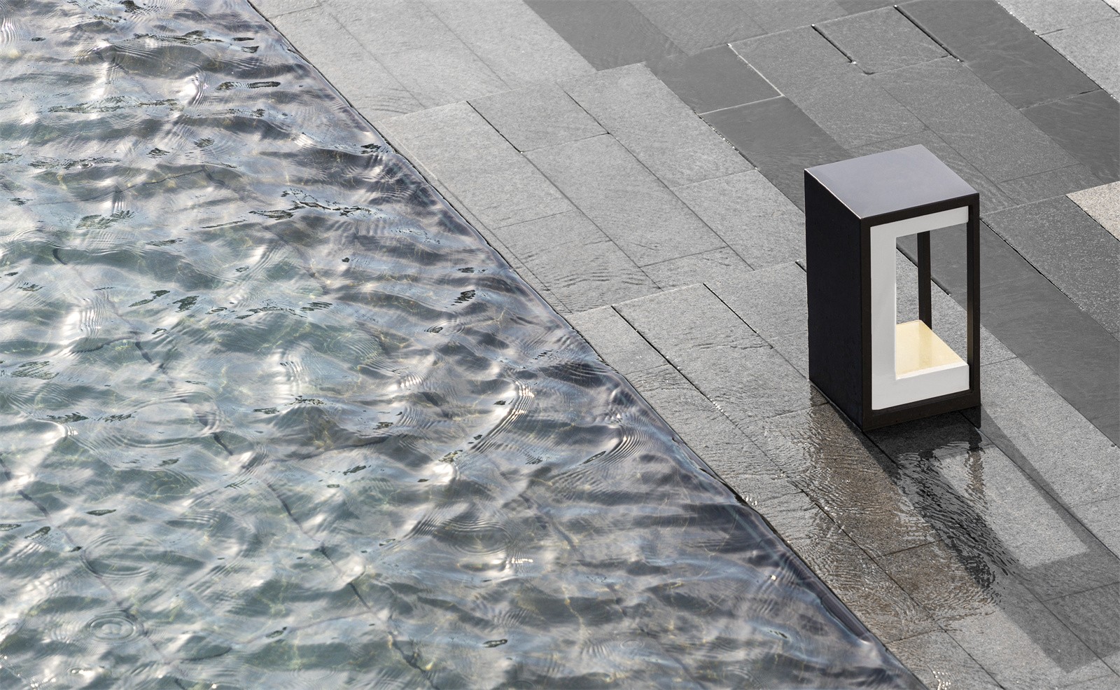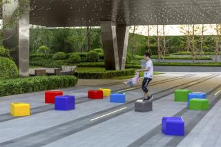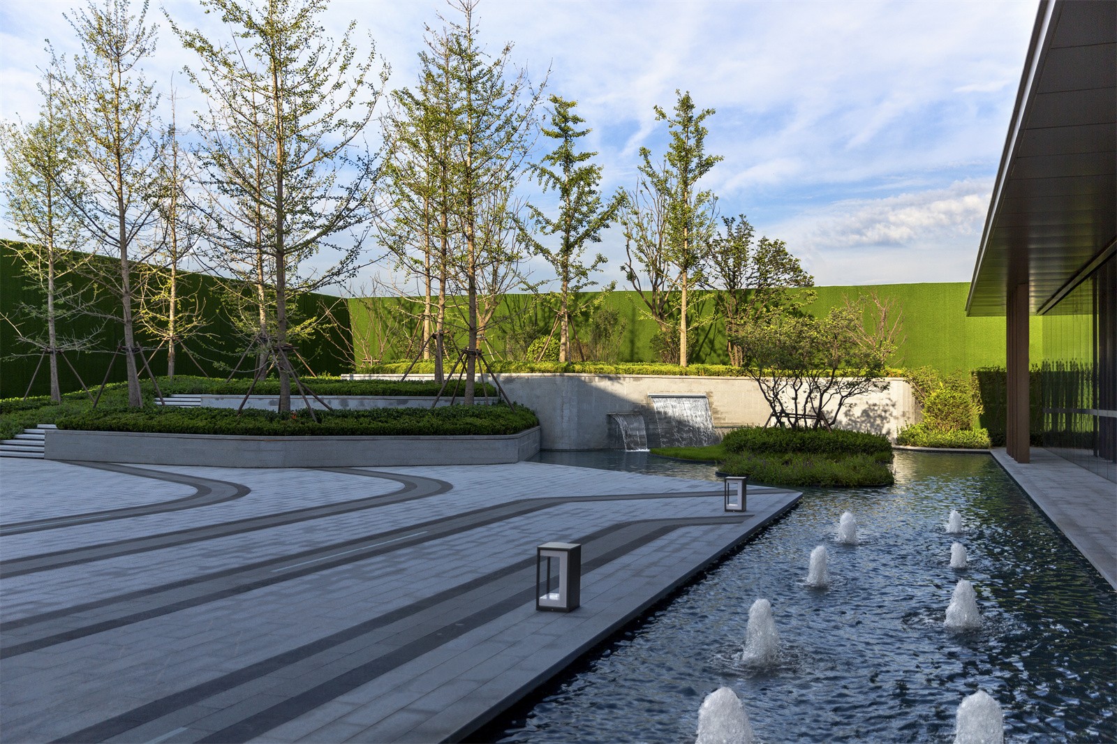 「街區(qū)式」的前場(chǎng),將建筑主體作為「大門」,未來(lái)社區(qū)之門外是以藝術(shù)水景、造型構(gòu)筑物、錯(cuò)落有致的微地形和引導(dǎo)性鋪裝,共同營(yíng)造的魅力空間。