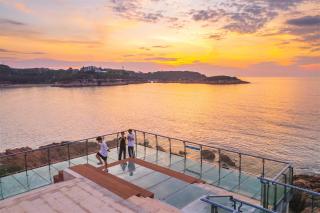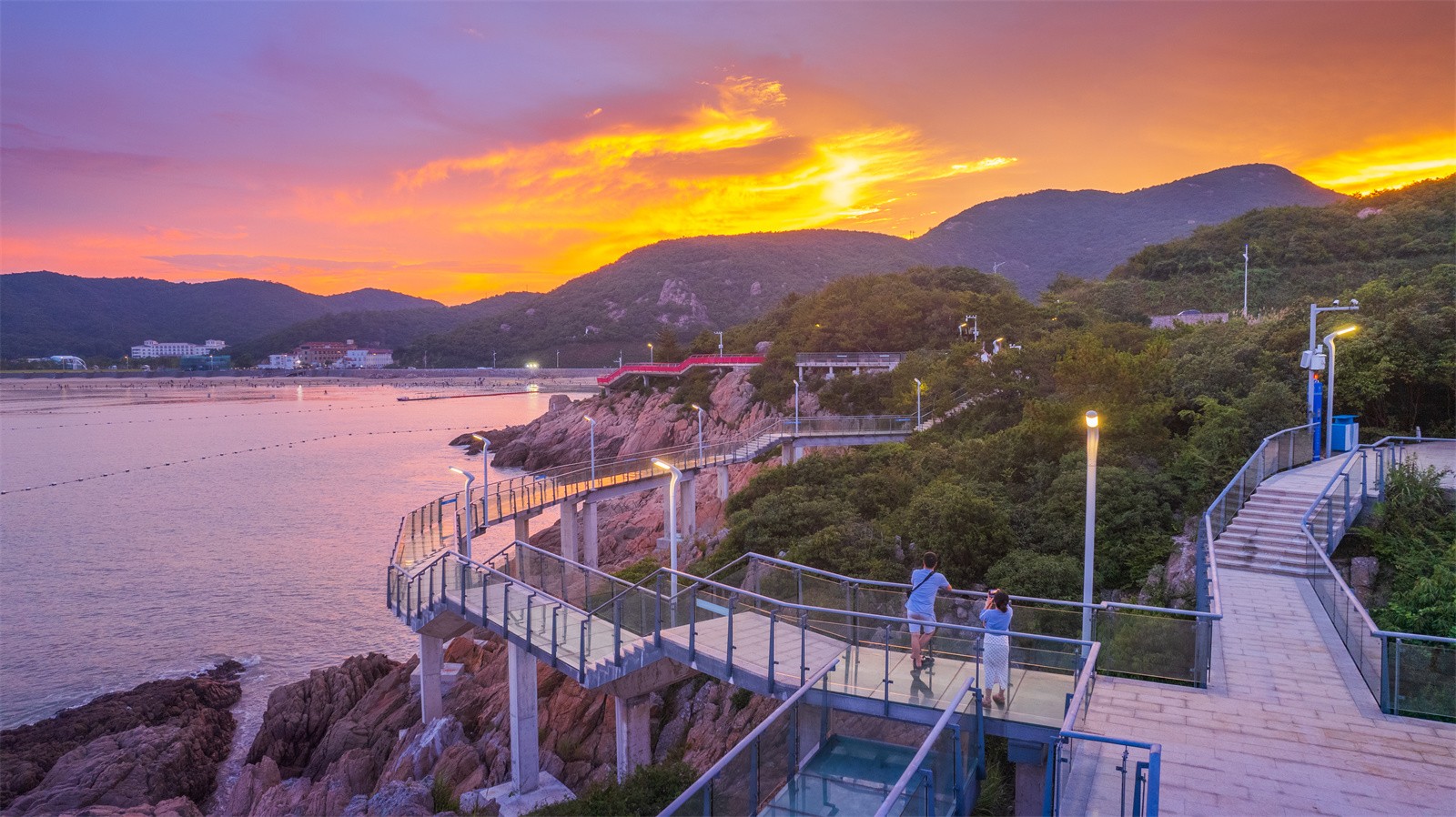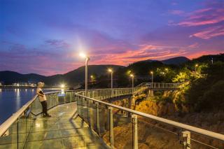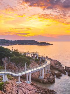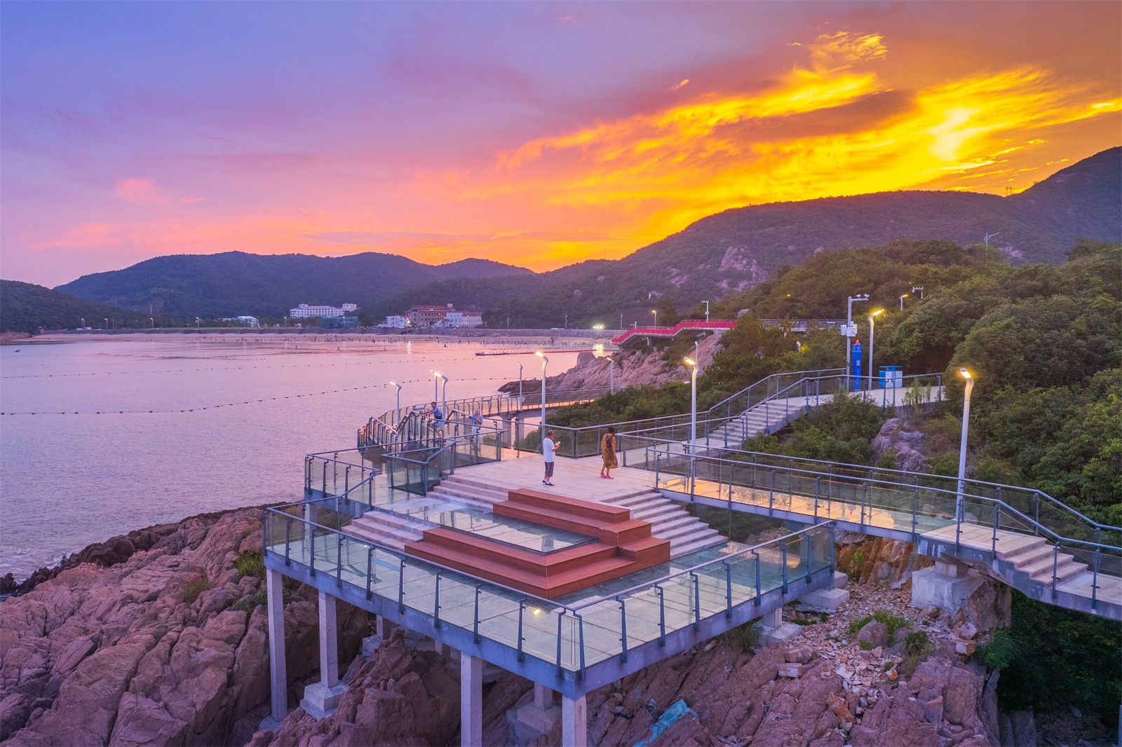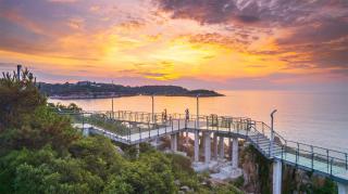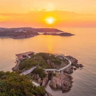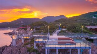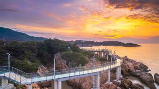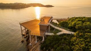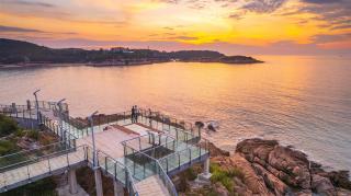 玻璃平臺(tái)是景區(qū)內(nèi)最靠近海的景觀節(jié)點(diǎn),是觀賞日出的絕佳場(chǎng)地。沿著礁石布置的平臺(tái)高低錯(cuò)落,立體的山海風(fēng)景在這里一覽無余。另外,利用平臺(tái)臺(tái)階的高差,結(jié)合木質(zhì)材質(zhì)設(shè)置滿足休憩功能的臺(tái)階,人們可以坐在這里吹海風(fēng),觀日出。