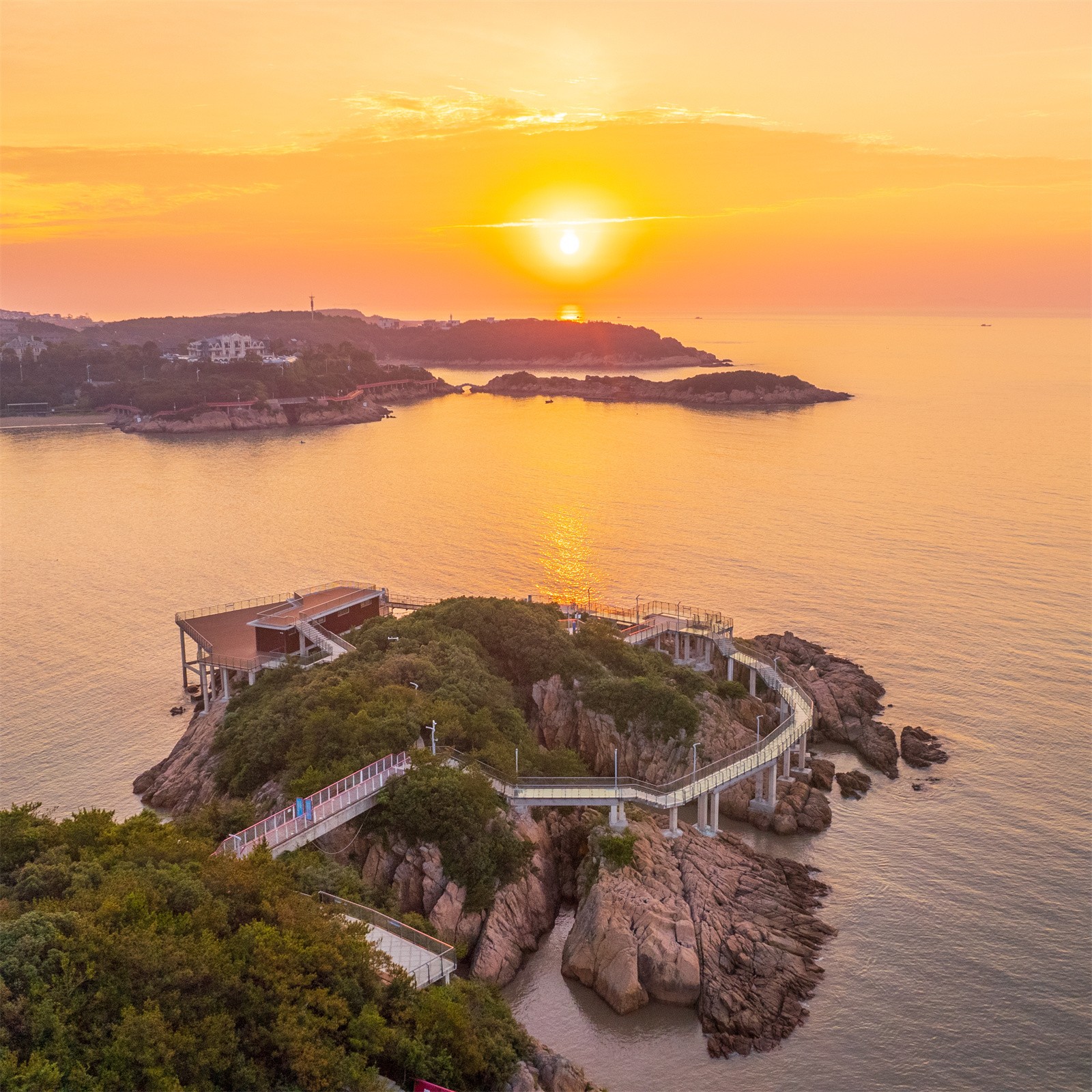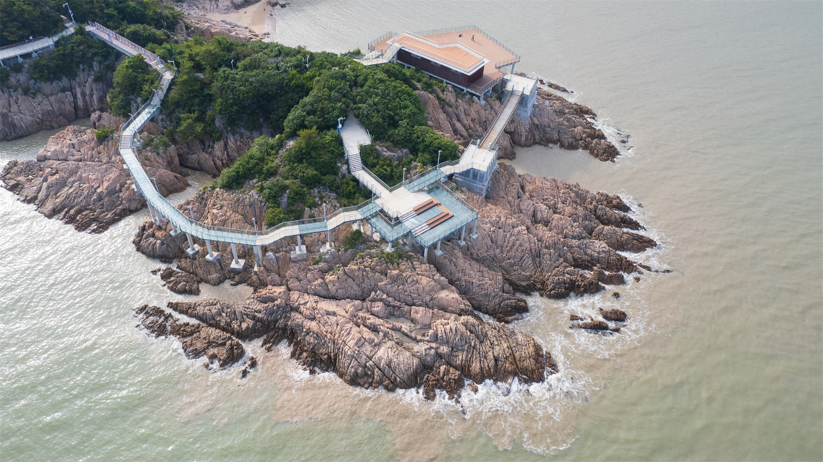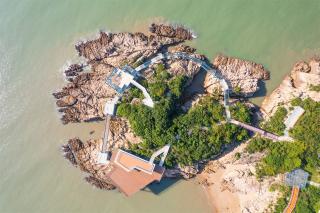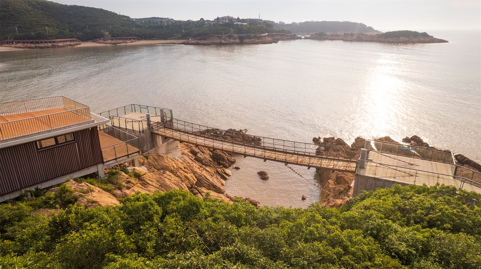 項(xiàng)目位于寧波松蘭山旅游度假區(qū)景區(qū),東沙灘北側(cè)的西翅膀半島上。玻璃棧道總長(zhǎng)度約兩百米,由觀景平臺(tái)、玻璃棧橋、索橋和配套用房四部分組成。作為對(duì)現(xiàn)有濱海游步道的延續(xù)和補(bǔ)充,玻璃棧道設(shè)置在大自然沖刷的礁石紋理之間,通過巧妙連接與跨越,成環(huán)狀懸扣于海天之間,如同鑲嵌在礁石之上的一枚鉆戒,與陽光、沙灘和海浪組成一幅精致壯麗的景觀畫面。同時(shí),為游客提供了一處沉浸式濱海體驗(yàn)的愜意空間。