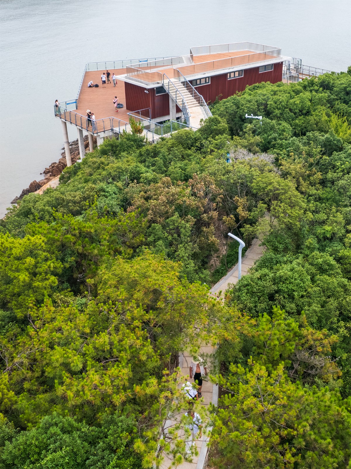 考慮到在設(shè)計(jì)中應(yīng)最大限度地對(duì)場(chǎng)地原有自然面貌進(jìn)行保護(hù)和利用,因此棧道在礁石上輕盈的穿過,在不破壞現(xiàn)狀地貌的條件下架起。與此同時(shí),對(duì)礁石上原有的植被也進(jìn)行了全部保留,棧道和構(gòu)筑物都沿著植被輪廓線布置,整體呈環(huán)狀向心形將場(chǎng)地和現(xiàn)狀道路串聯(lián)。在壯闊的海景另一側(cè),就是海岸上豐富的自然空間。