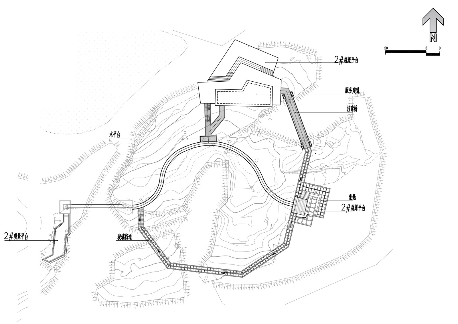 輕盈的索橋結(jié)構(gòu)輕松跨越了25米寬的鴻溝,將觀景平臺(tái)和服務(wù)建筑連接,使玻璃棧道形成閉環(huán)。
