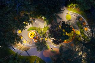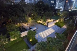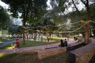 Tall trees lushly form a natural dome. Turning the slightly sloping terrain into a natural stone collage of stacking benches, reshaping the dense ground cover into an undergrowth terrace, and adding linear lighting as decoration, all these measures transformed the formerly unusable space into a multifunctional mini-theatre. Different activities such as senior citizens' orchestra, community films, park promotions, and a children's stage play take place here, which have greatly enhanced the park's activity experience.