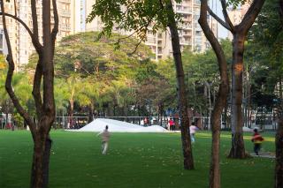 俯瞰公園,叢林環(huán)抱著中心草坪,如自然之手,掬一捧自由的樂(lè)園獻(xiàn)給城市。改造方案仍將開(kāi)敞草坪作為公園的中心,在不減少使用面積的前提下,進(jìn)行完形設(shè)計(jì),同時(shí)與周邊的林木交融,通過(guò)海綿化提升了草坪的性能。全年齡段的使用者都可以在這里找到自己喜歡的使用方式,互相兼容,又保持著各類人群的“生態(tài)位”。