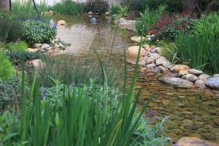設(shè)計(jì)將原本困在角落里的水塘改造為彈性旱溪景觀,融合地形與林下景觀,以礫石鋪底自然凈化水體,以耐水濕植物形成生態(tài)護(hù)岸,豐富景觀效果并實(shí)現(xiàn)海綿功能,全年可蓄滯消納徑流量約1475立方米。