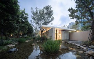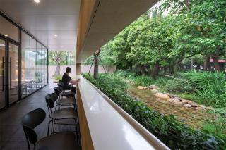 A small courtyard with an exquisite water view, where trees, verandahs, streams and landscape walls come together form a scenery, where one can sit in the bar and read a book, watch the flowing water and flowers, and look out through the woods, like watching a silent movie.