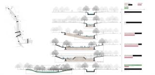 針對(duì)這一問題,我們提出了城市行泄“溪道”的設(shè)計(jì)理念。在城市道路這個(gè)地表雨水行泄網(wǎng)絡(luò)中找出雨水疏導(dǎo)的關(guān)鍵區(qū)域,尋找綠地空間,模擬自然溪流環(huán)境,建立通向河湖的雨水行泄“溪道”?!跋馈苯雍铣鞘械缆泛途G地系統(tǒng)設(shè)計(jì),創(chuàng)造出一種彈性的、多效益的應(yīng)對(duì)城市洪澇風(fēng)險(xiǎn)的綠地景觀。其在中小降雨時(shí)可實(shí)現(xiàn)雨水的凈化與下滲,在大降雨時(shí)可排放超標(biāo)雨水。