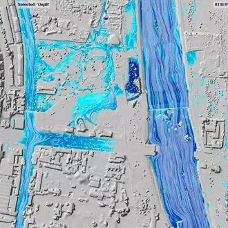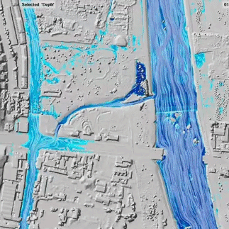 項(xiàng)目采用0.5m*0.5m高分辨率地形數(shù)據(jù),通過GIS地形數(shù)據(jù)分析和水文模型模擬,生成城市洪澇風(fēng)險(xiǎn)圖,精確反映了城市遭遇暴雨時(shí)地表徑流的匯流線路、流態(tài),以及與建筑物和城市道路的關(guān)系。