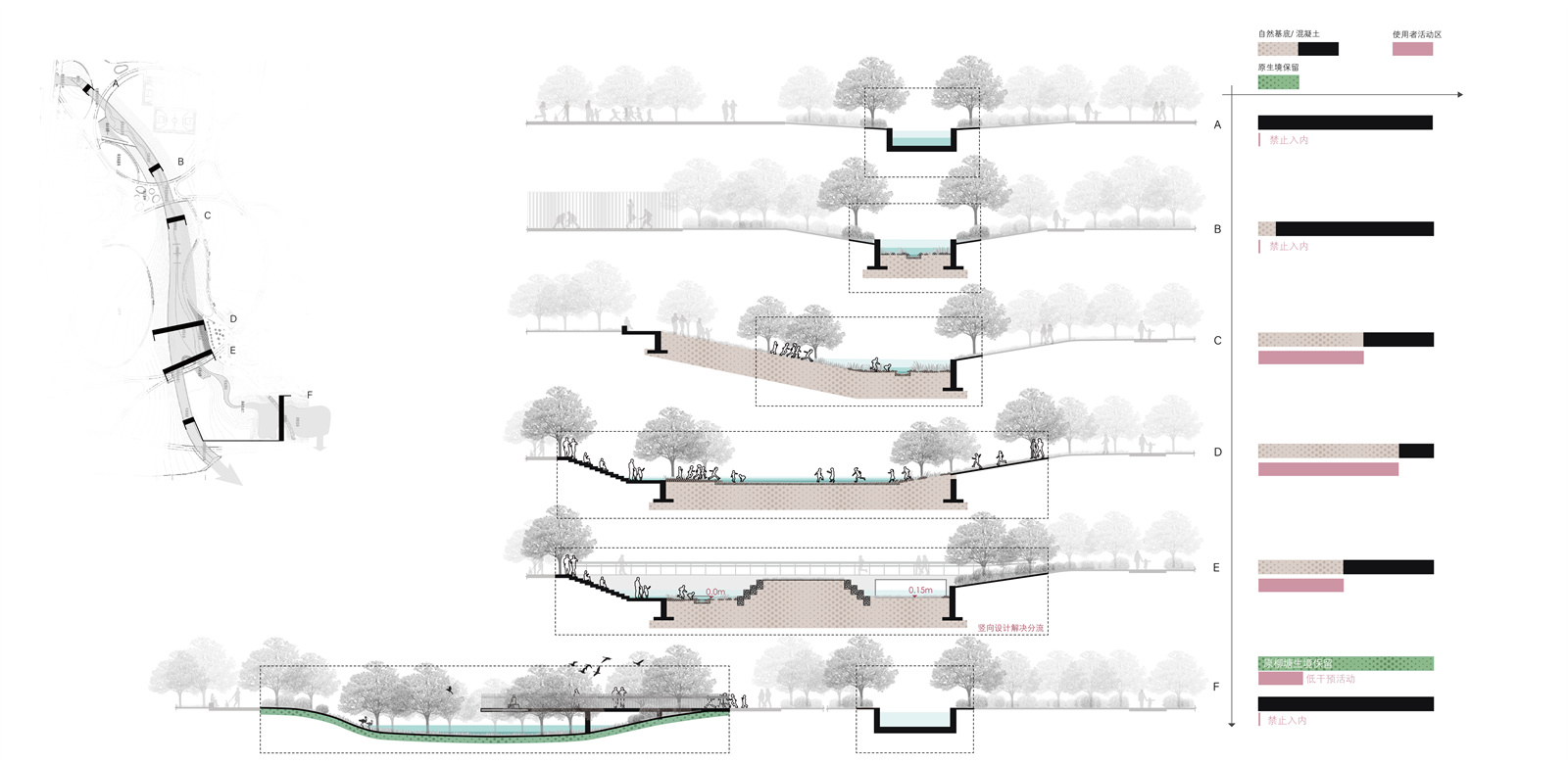 為實(shí)現(xiàn)城市“溪道”針對(duì)大型降雨和中小型降雨的雙重控制目標(biāo),我們?yōu)橄涝O(shè)計(jì)了兩條線路,大雨時(shí)雨洪通過主干渠流入清水河,中小降雨時(shí)則進(jìn)入支線的蓄滯空間。主干渠延用了場(chǎng)地原排水溝路徑,保證工程的土質(zhì)穩(wěn)定,并減少新建設(shè)土方。