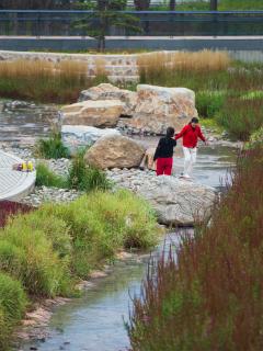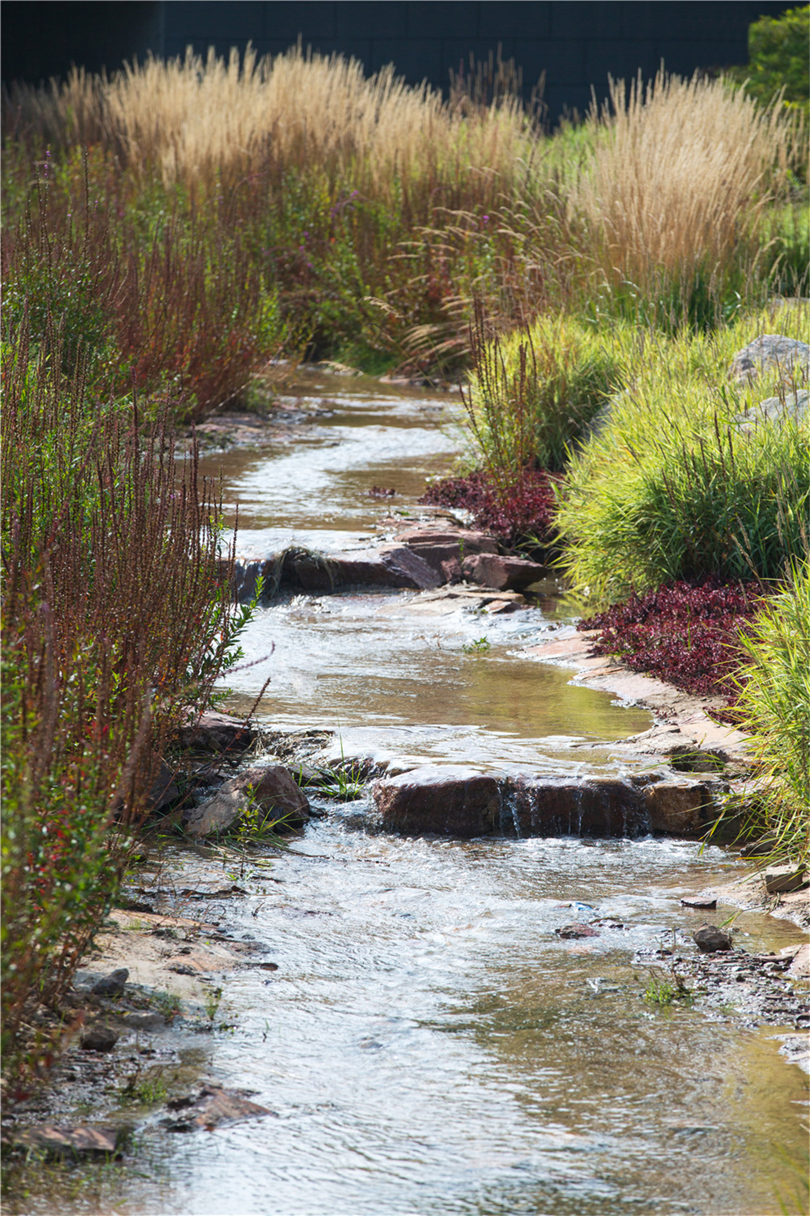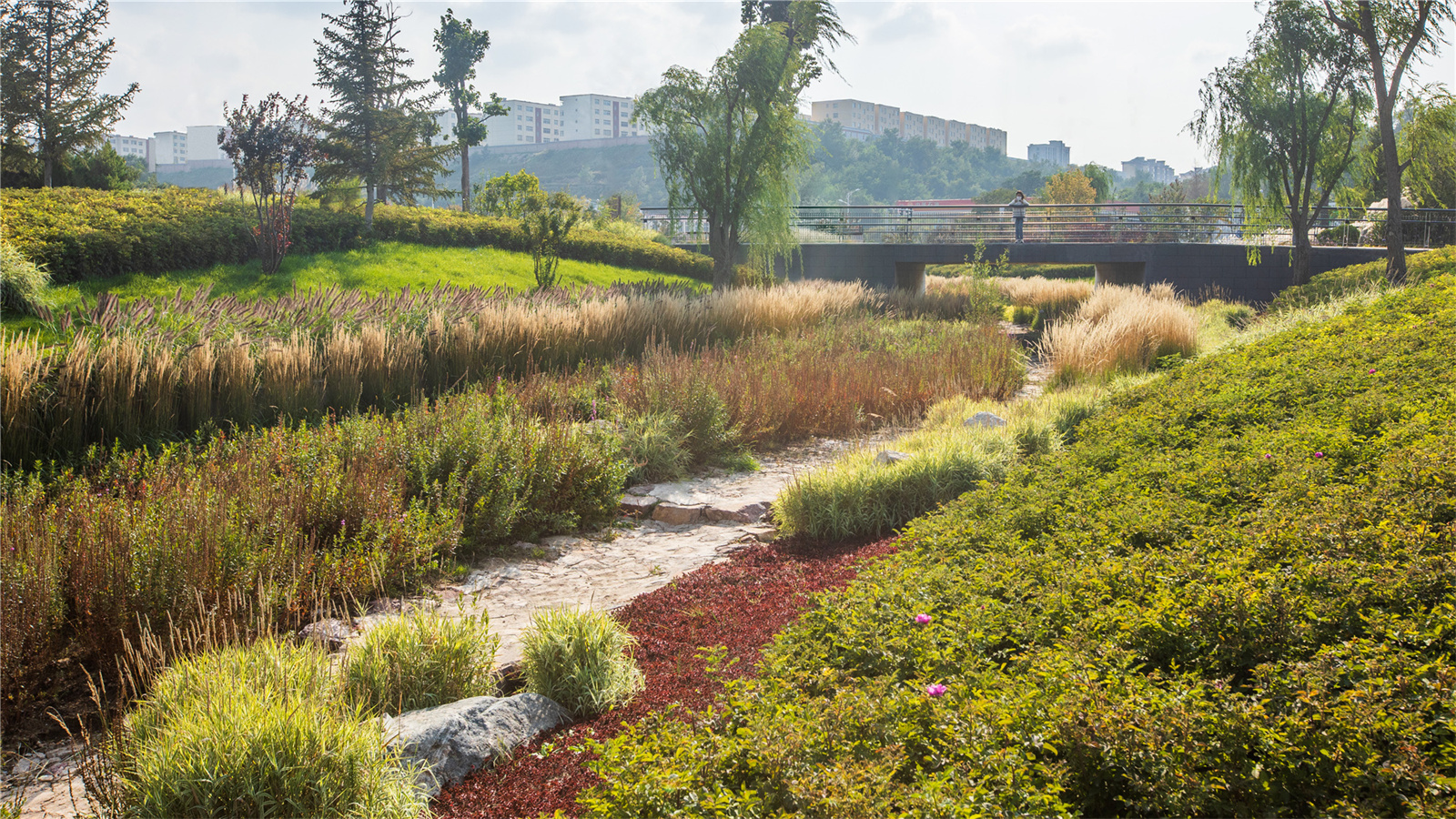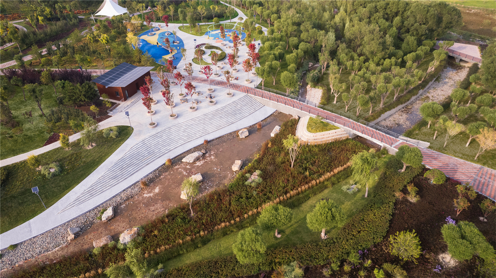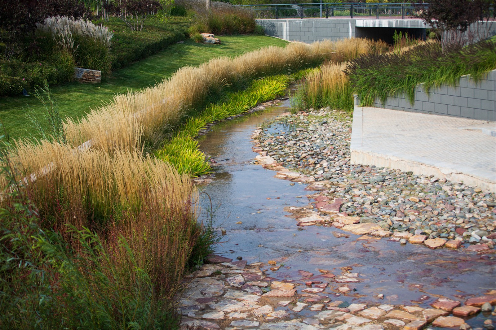 設(shè)計(jì)打破了溝渠斷面單一尺寸的設(shè)計(jì)慣例,營造如自然溪道一般的寬窄深淺連續(xù)變化的空間。通過縱坡坡度的變化,整個(gè)溪道形成急流、跌水、淺灘、緩流等不同狀態(tài)。開敞的溪道段中植入人們的活動(dòng)空間,打造了運(yùn)動(dòng)球場(chǎng)、休閑草坪、親水兒童樂園以及生態(tài)柳林濕地等不同的休閑體驗(yàn),將生活融入到城市“溪道”環(huán)境中。