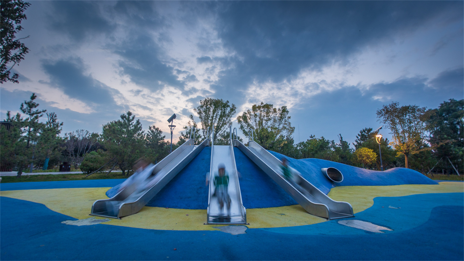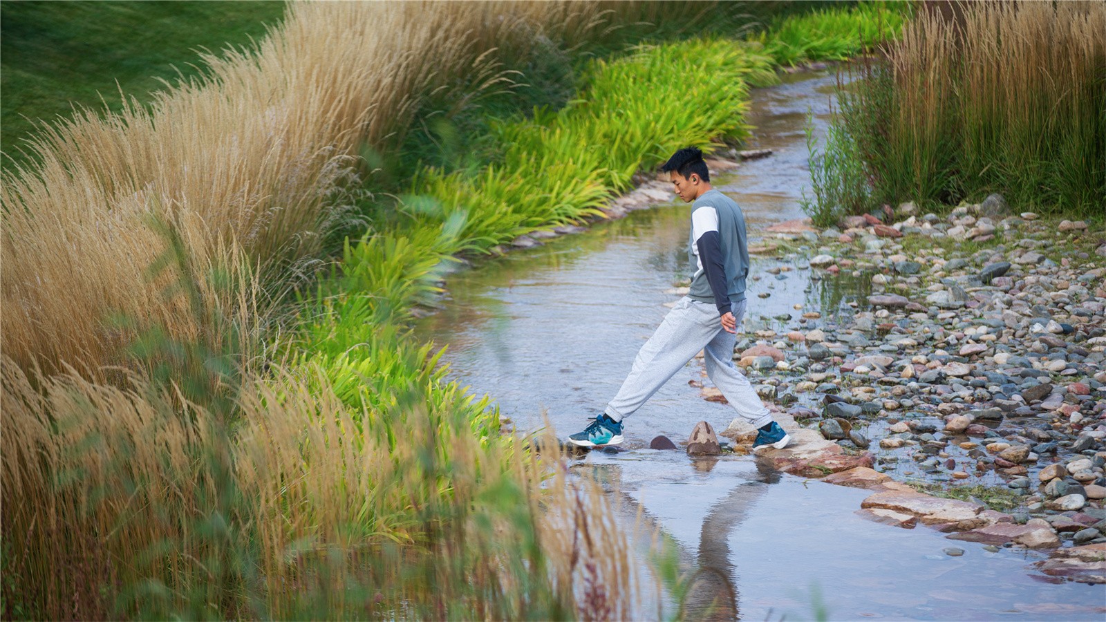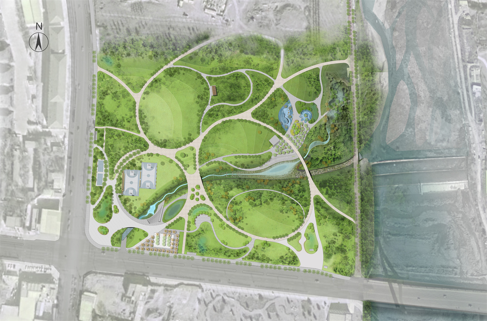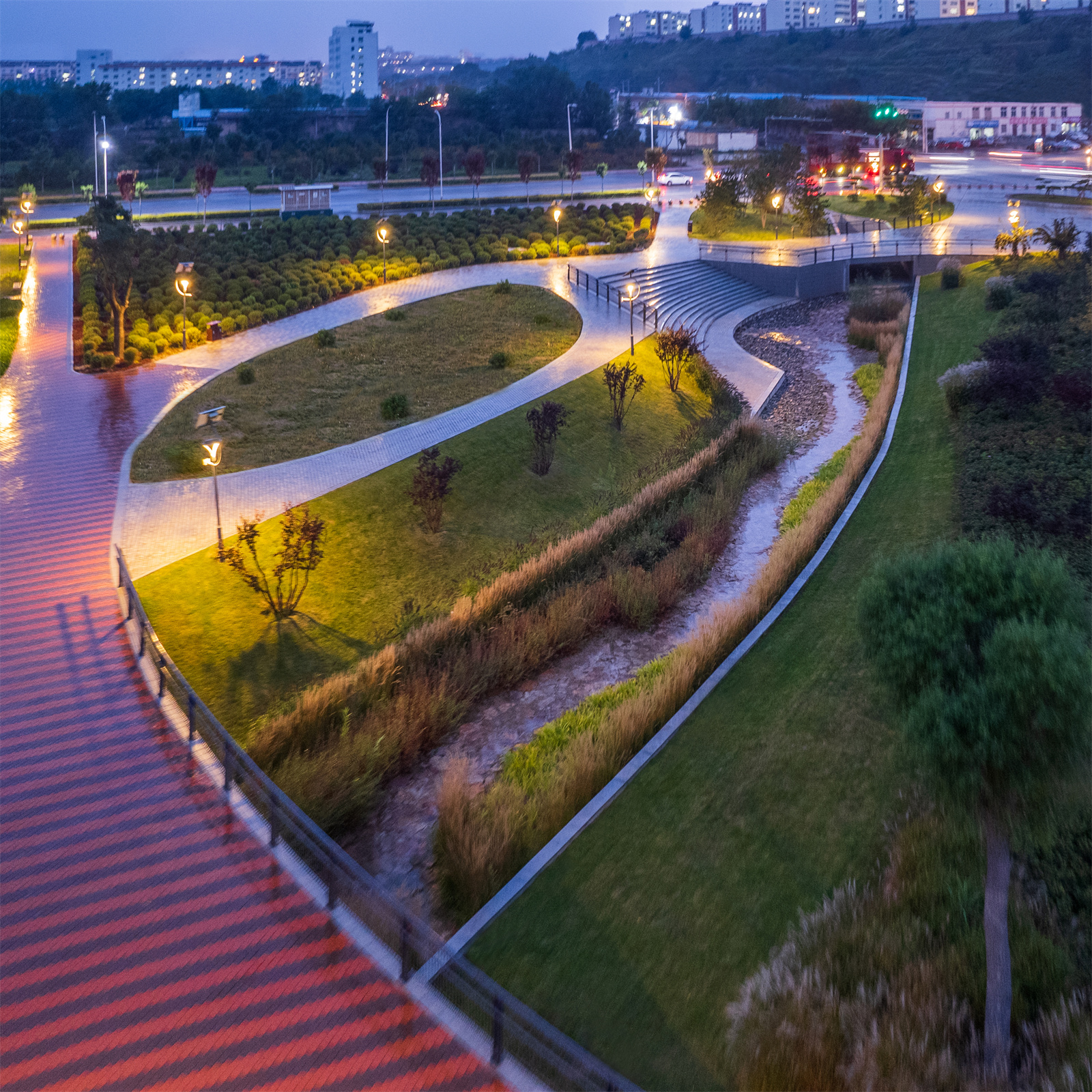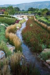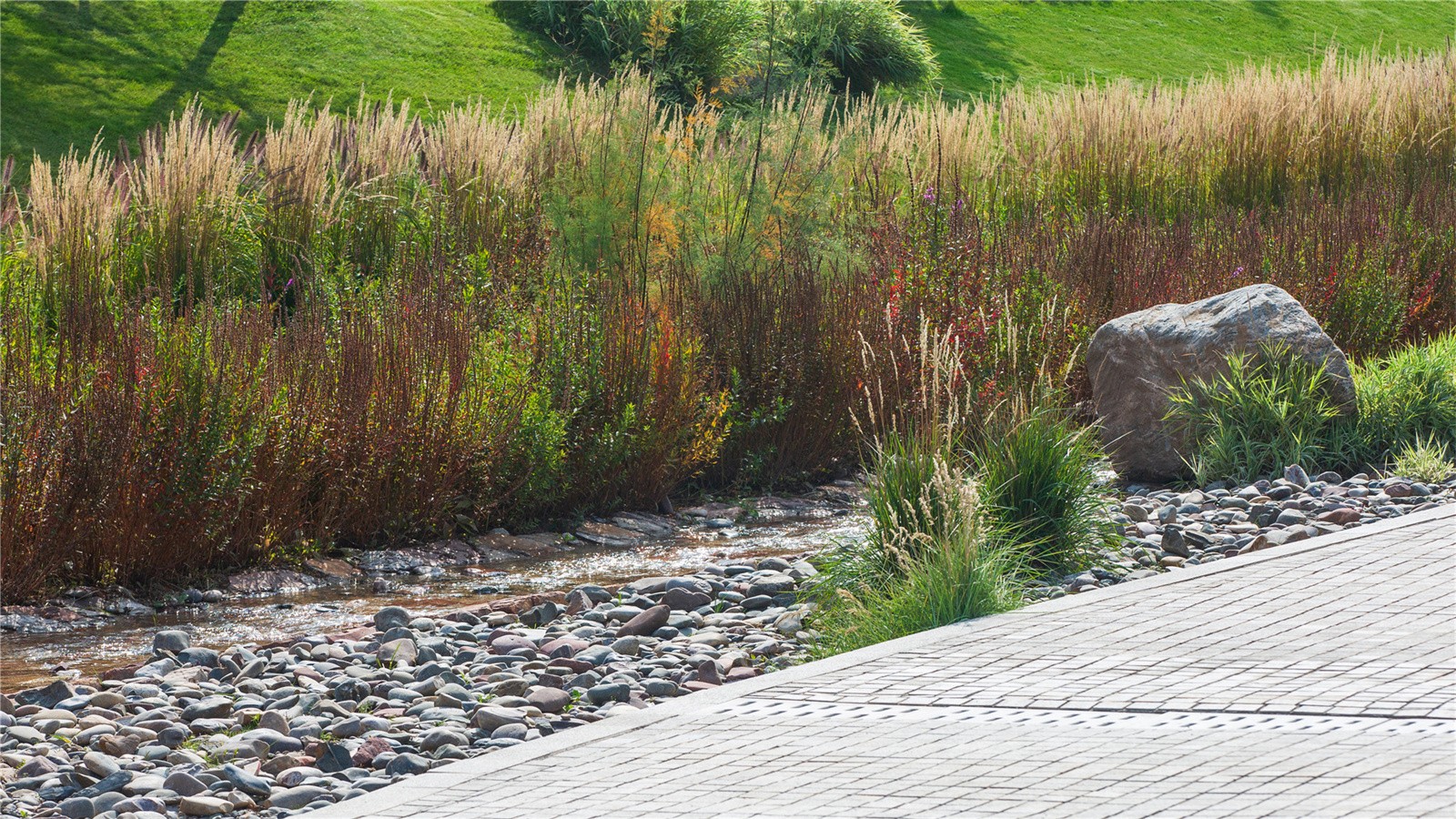 設(shè)計(jì)打破了溝渠斷面單一尺寸的設(shè)計(jì)慣例,營造如自然溪道一般的寬窄深淺連續(xù)變化的空間。通過縱坡坡度的變化,整個(gè)溪道形成急流、跌水、淺灘、緩流等不同狀態(tài)。開敞的溪道段中植入人們的活動(dòng)空間,打造了運(yùn)動(dòng)球場(chǎng)、休閑草坪、親水兒童樂園以及生態(tài)柳林濕地等不同的休閑體驗(yàn),將生活融入到城市“溪道”環(huán)境中。