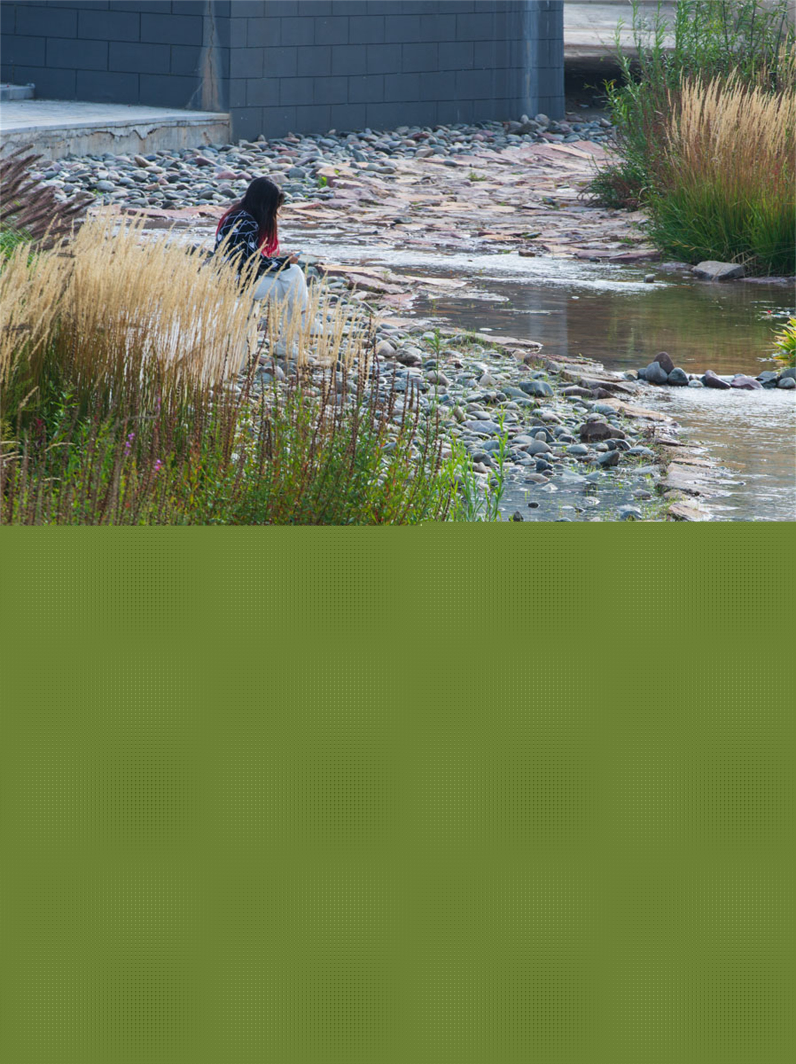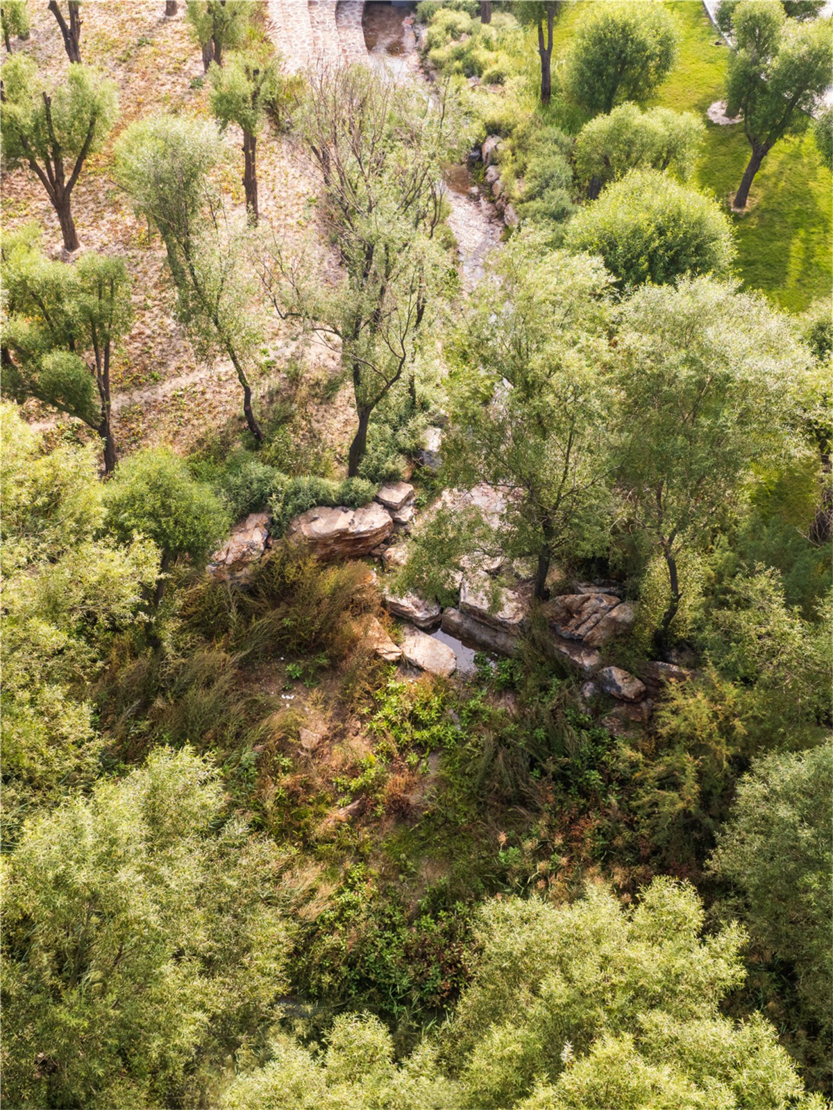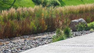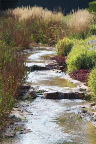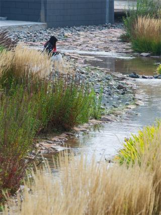 溪流不僅能疏導(dǎo)城市雨洪,提供自然的親水空間,還能為棲息在清水河的鳥類、雉等生物提供水源及藏身之所。柳林塘濕地被原封不動(dòng)地保留下來,構(gòu)成清水河優(yōu)質(zhì)的濱河濕生生境。溪道駁岸80%設(shè)計(jì)為平緩草坡,這讓生物能輕松地進(jìn)入溪流。溪底設(shè)計(jì)碎石灘涂,為鳥類、雉飲水提供安全的“腳踏板”。溪底碎石形成了不同大小的孔隙,為各種昆蟲、底棲生物提供棲息空間。
