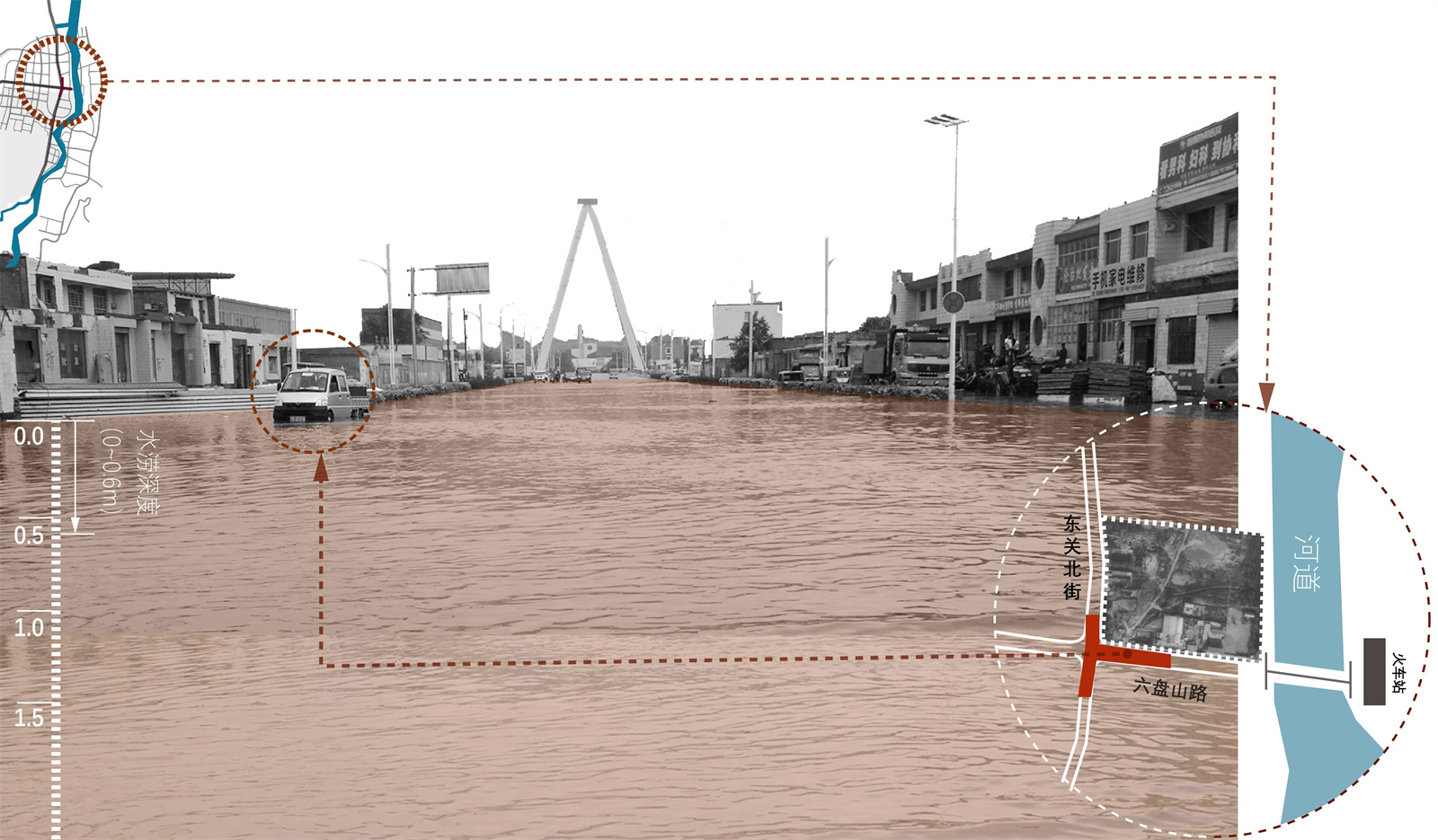 同時(shí)由于濱河空間的密集開發(fā),以及清水河河堤高于東關(guān)街的豎向關(guān)系,滯留在火車站橋口低洼處的雨水缺少流向清水河的通道,從而在此處不斷積存,進(jìn)一步造成整條東關(guān)街的積澇,也增加了下游城區(qū)的防澇壓力。