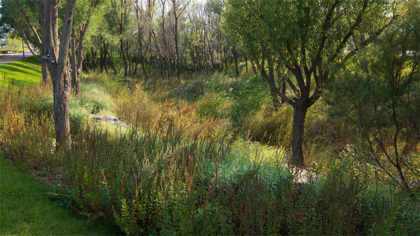 支線的蓄滯濕地利用了現(xiàn)有的柳林塘,在蓄滯凈化雨水的同時(shí)也維持了原生濕地生境,為這片快速變化的清水河畔保留下彌足珍貴的場(chǎng)地記憶和景觀財(cái)富。