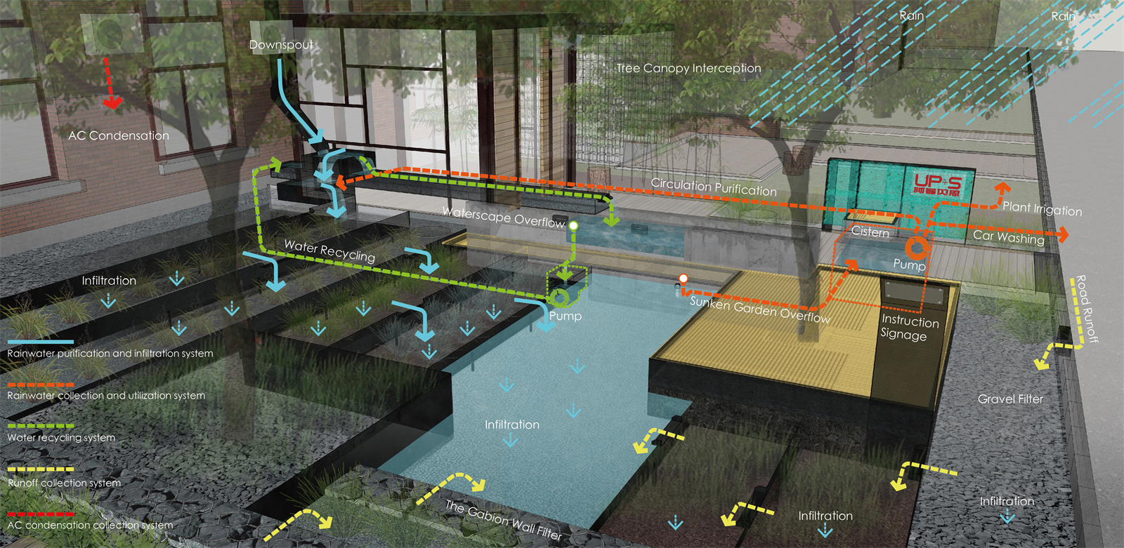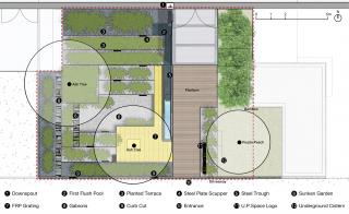 在雨水花園中,設計打造了一套完整的徑流管理系統(tǒng)。屋頂雨水經(jīng)落水管進入棄流池初步沉淀后,一部分進入循環(huán)水景,另一部分通過層層臺地滯留、凈化、下滲,雨水徑流以最長線的行走距離,匯入中心下沉花園;道路雨水從開口道牙經(jīng)過臺地凈化,最終也一并匯入下沉區(qū)域。當雨水量超過設計容量時,多余雨水通過溢流設置排入地下貯水池,在雨后隨泵運送至第二層臺地循環(huán)凈化,或用于澆灌、洗車等,使場地內(nèi)部雨水自行消解。