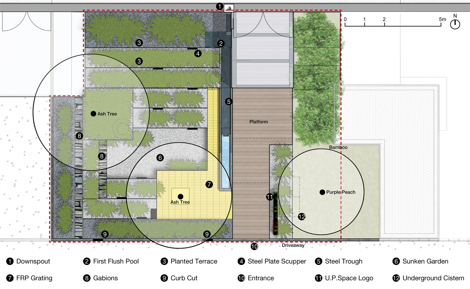 團隊挖掘場地的特質(zhì),在設計過程中深度研究造價、維護與環(huán)境策略,打造低影響、低維護的低碳景觀。建設期間,下沉花園與上層臺地土方平衡,未發(fā)生外運成本;同時,運用景觀化處理手段,使植物與材料成為花園主角,讓雨水設施煥發(fā)生機與活力。秉持“基于源頭控制、延緩沖擊負荷”的設計理念,設計力圖營建一個與場地條件相適應的雨水調(diào)蓄空間,實現(xiàn)雨水資源化管理,打造充滿藝術氣息的“雨水銀行”。